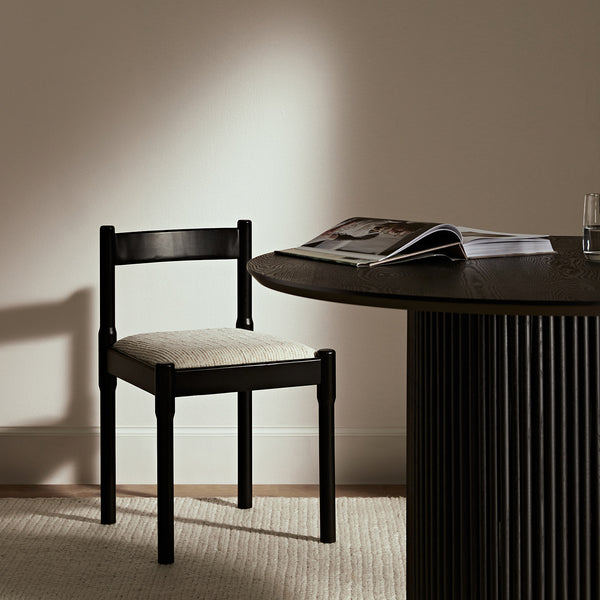 Complete the look: Pictured with the Minley Black Matte 2-in-1 Dining Chair is our Maru Black Round Oak Pedestal Dining Table and Aurora Hand Braided Cream Jute Rug.