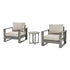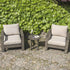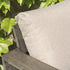 - Comprising of a sturdy aluminium frame with a hand brushed silver oak effect finish, the bistro set has sumptuous seat and back cushions, making it perfect for comfortable outdoor seating.