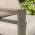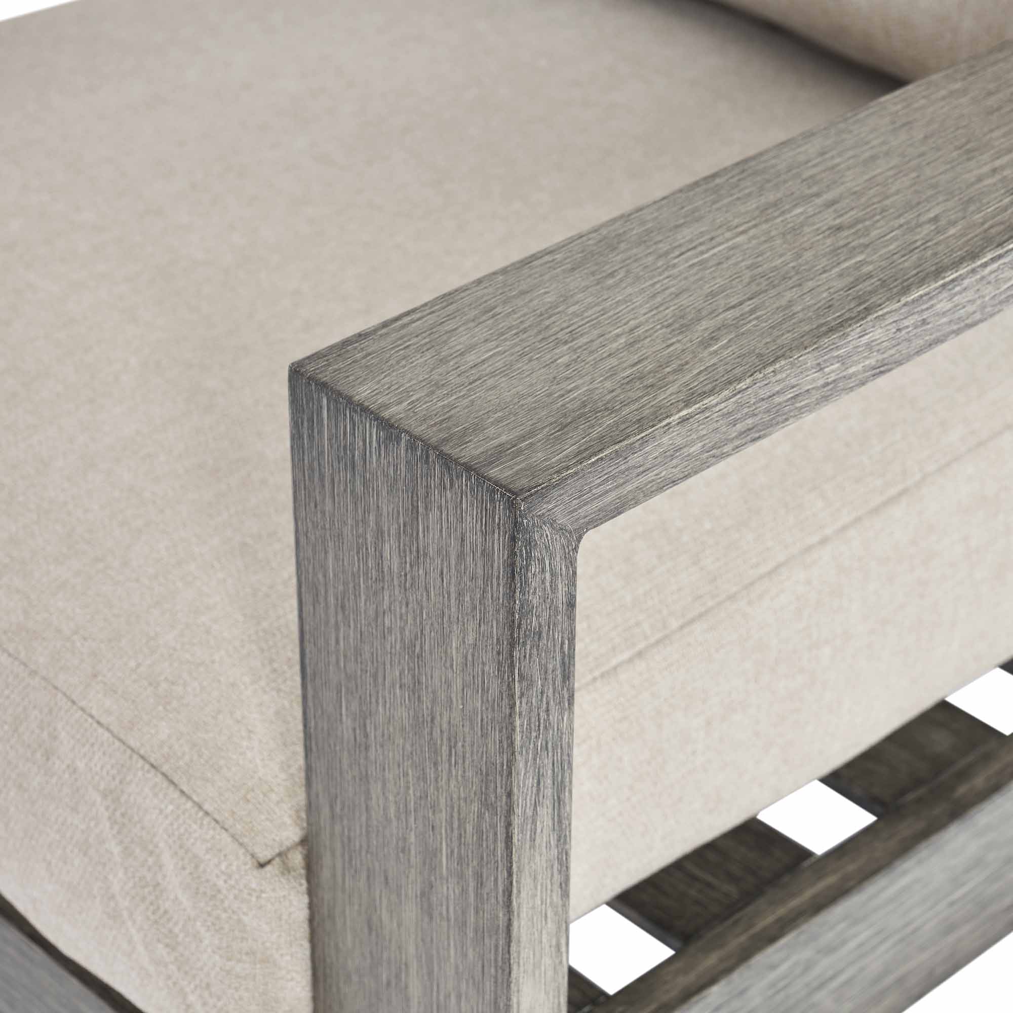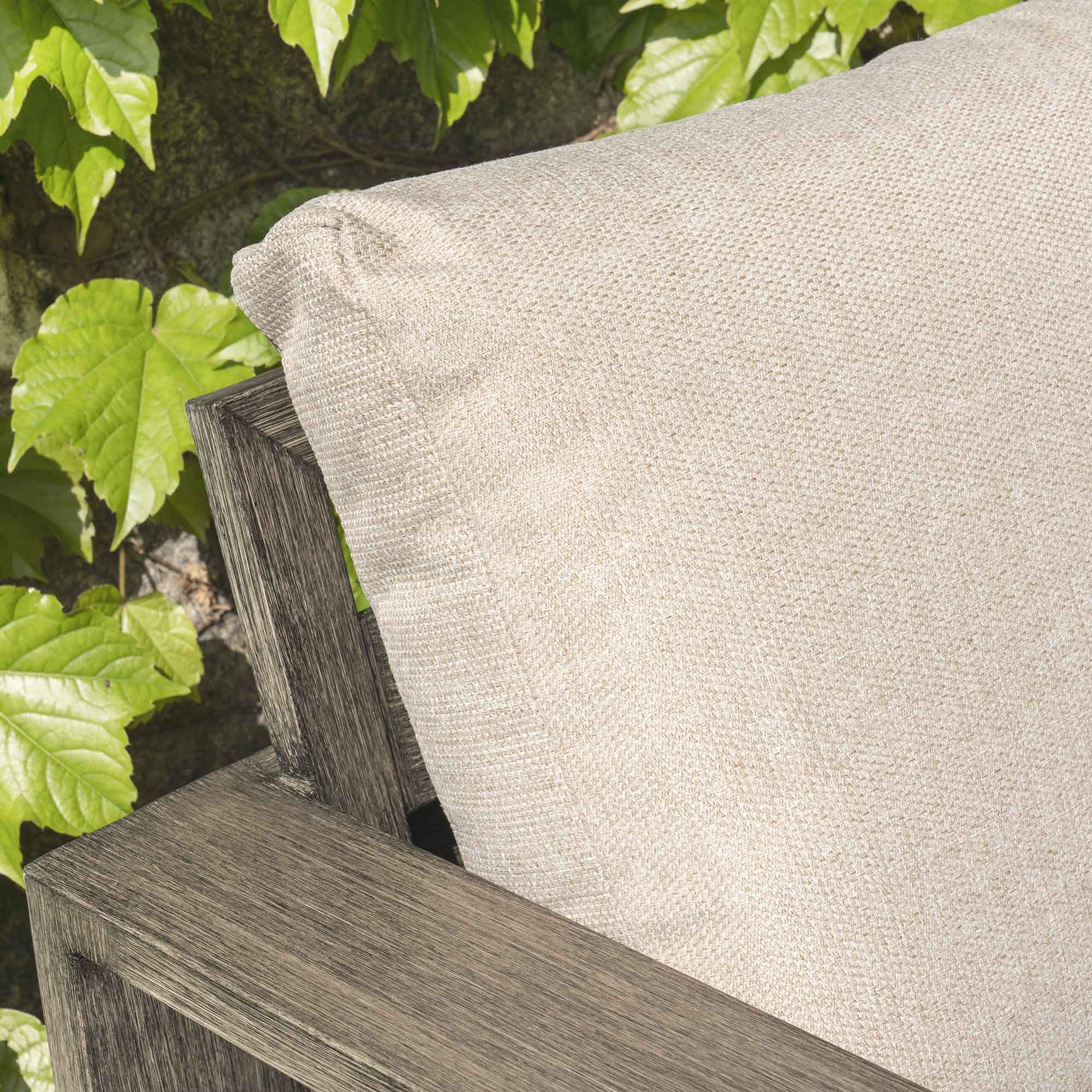 - Deep foam filled back and seat cushions are upholstered with UV resistant fabric in an elegant light taupe woven fabric to coordinate with the frame.