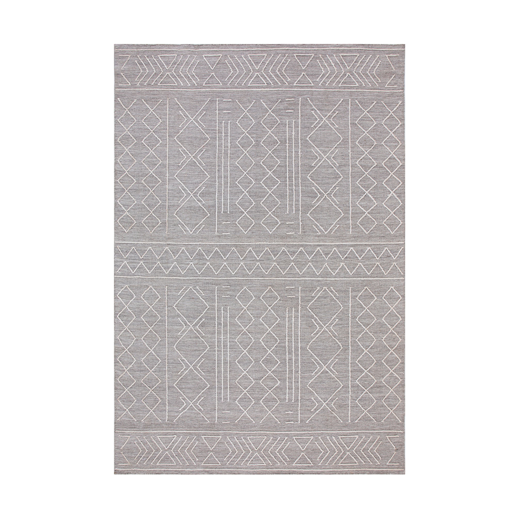 - With a steel grey colour at the forefront of the Nyla rug, the look is enhanced with a complimentary, geometric hand woven Aztec inspired design which will add some character to both indoor and outdoor spaces alike.
