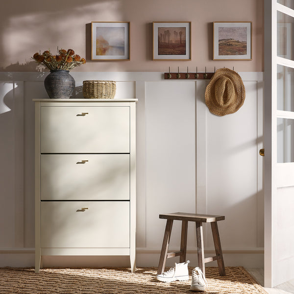 - Elevate your hallway storage with the refined elegance of our 3-tier shoe cabinet in Shaded White—a soft, chalky neutral inspired by timeless heritage interiors.