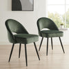 - The set includes 2 dining chairs upholstered in dark green velvet fabric with black piping details.