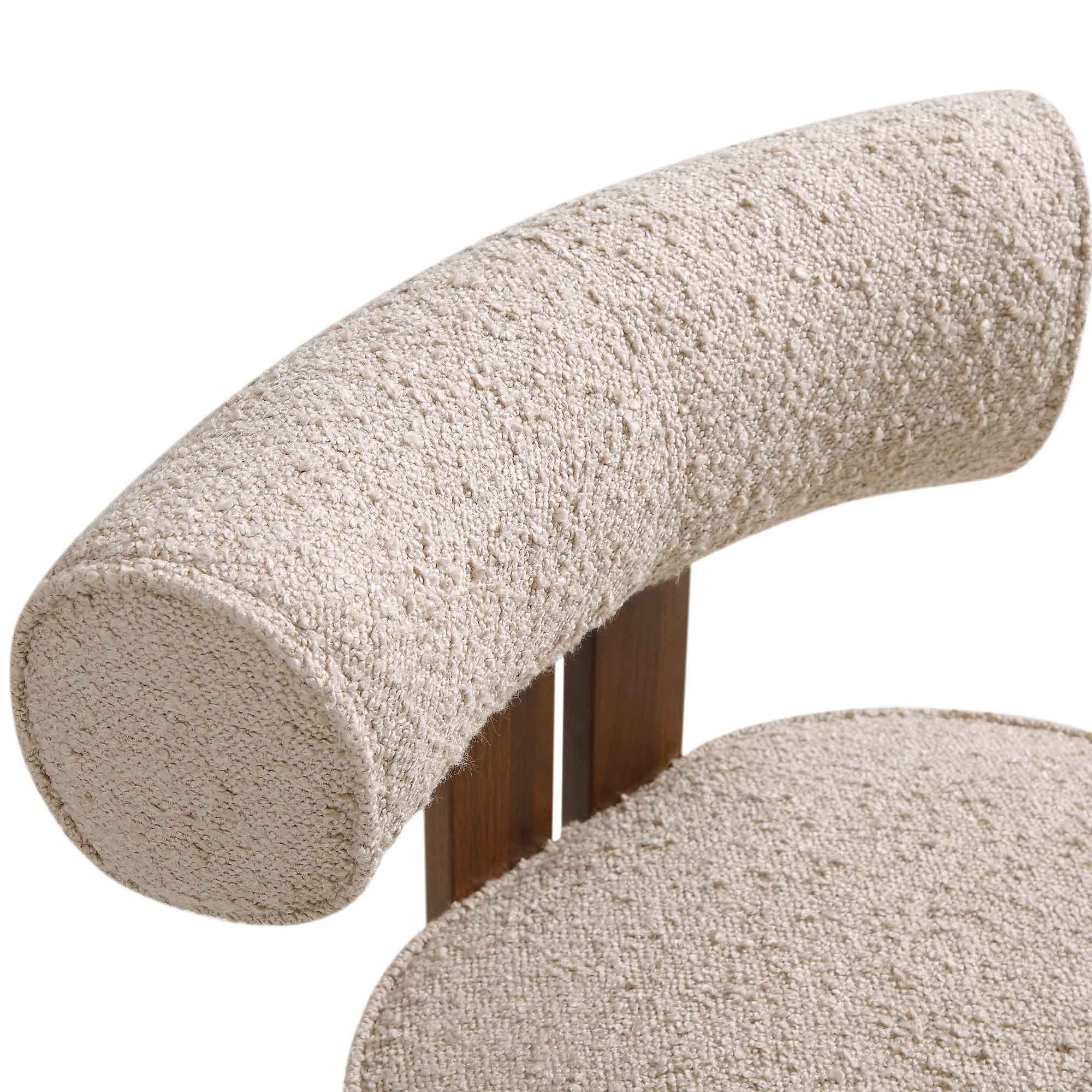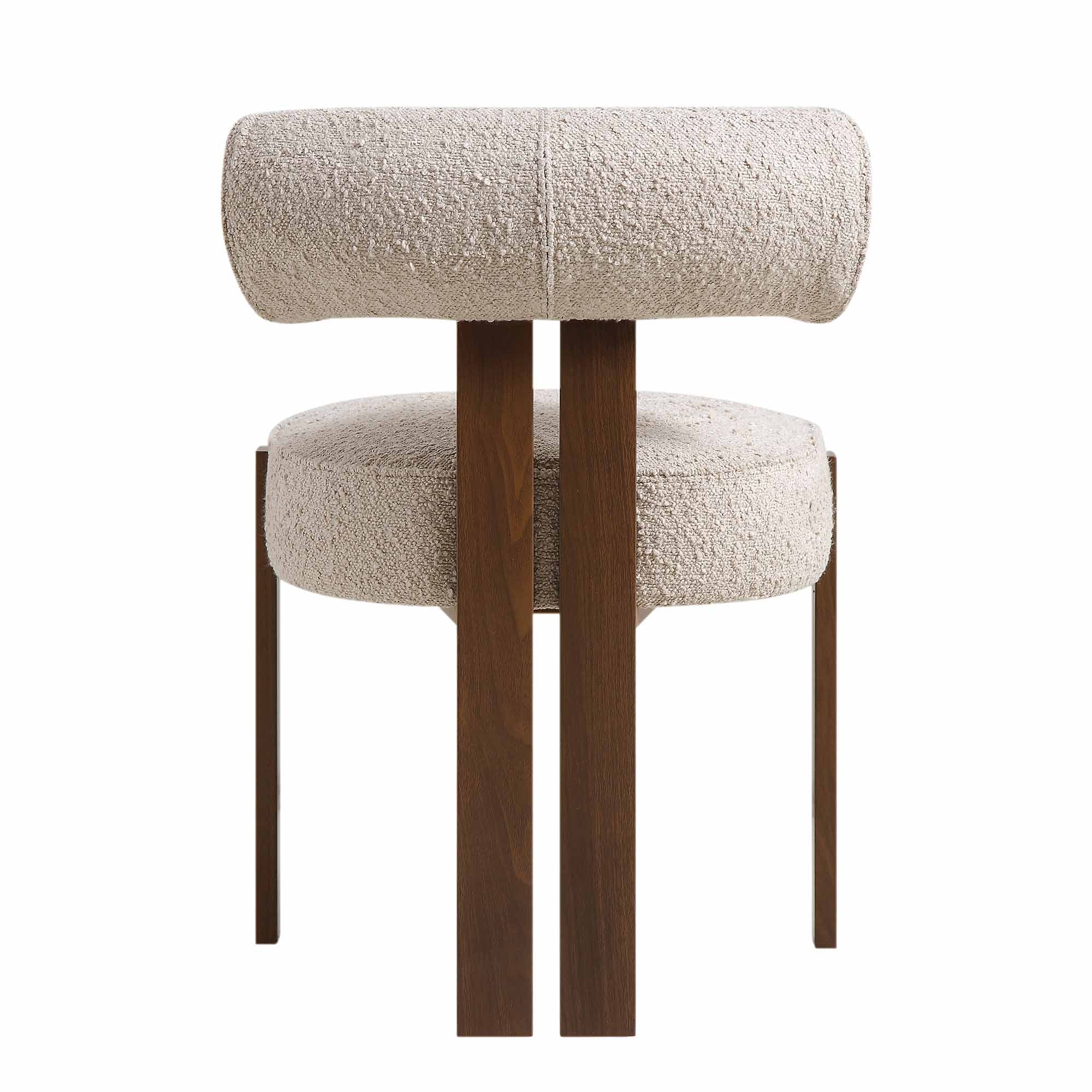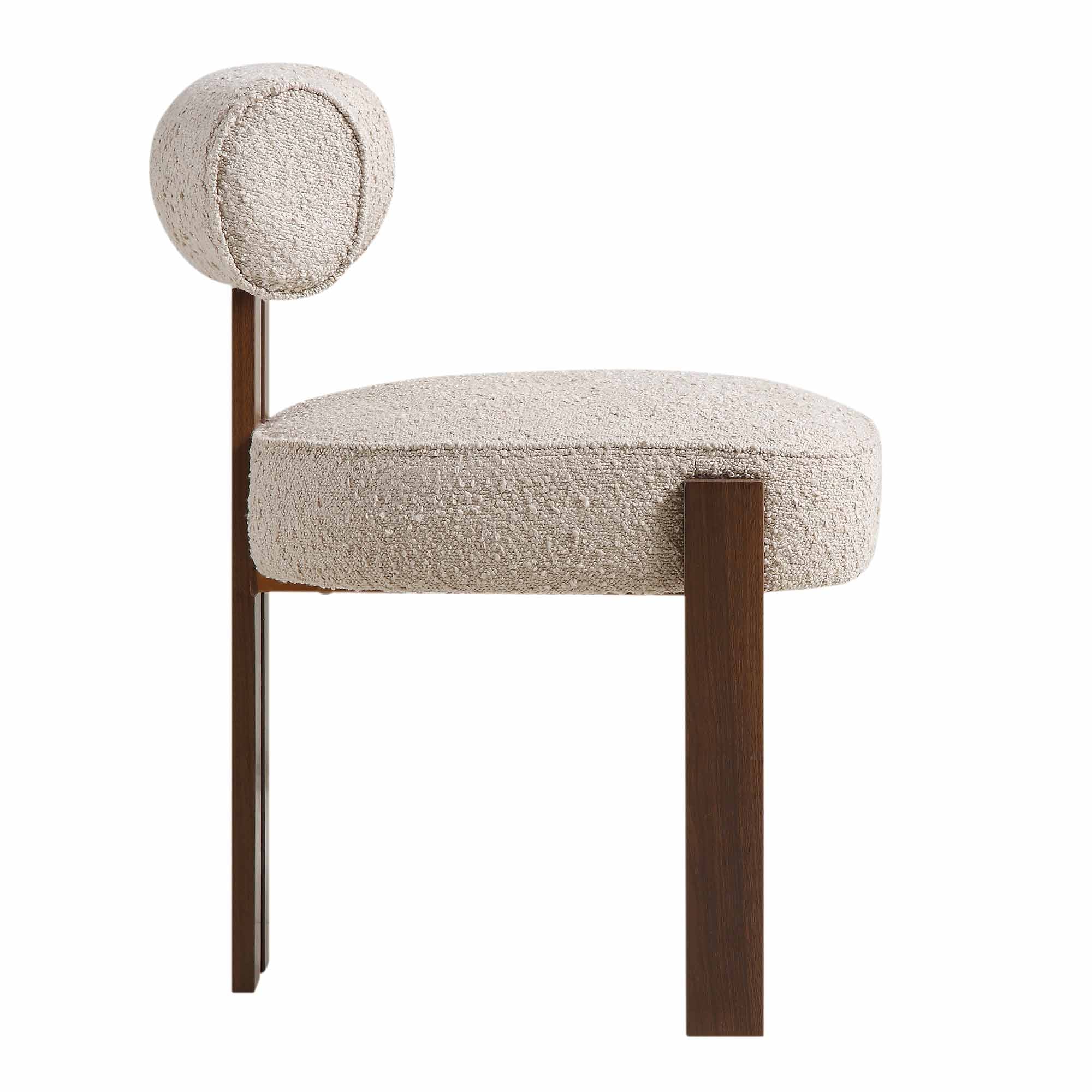 Combining chic taupe boucle upholstery and walnut wood effect frame, our Ophelia dining chair fits seamlessly in your room to create an inviting dining space.