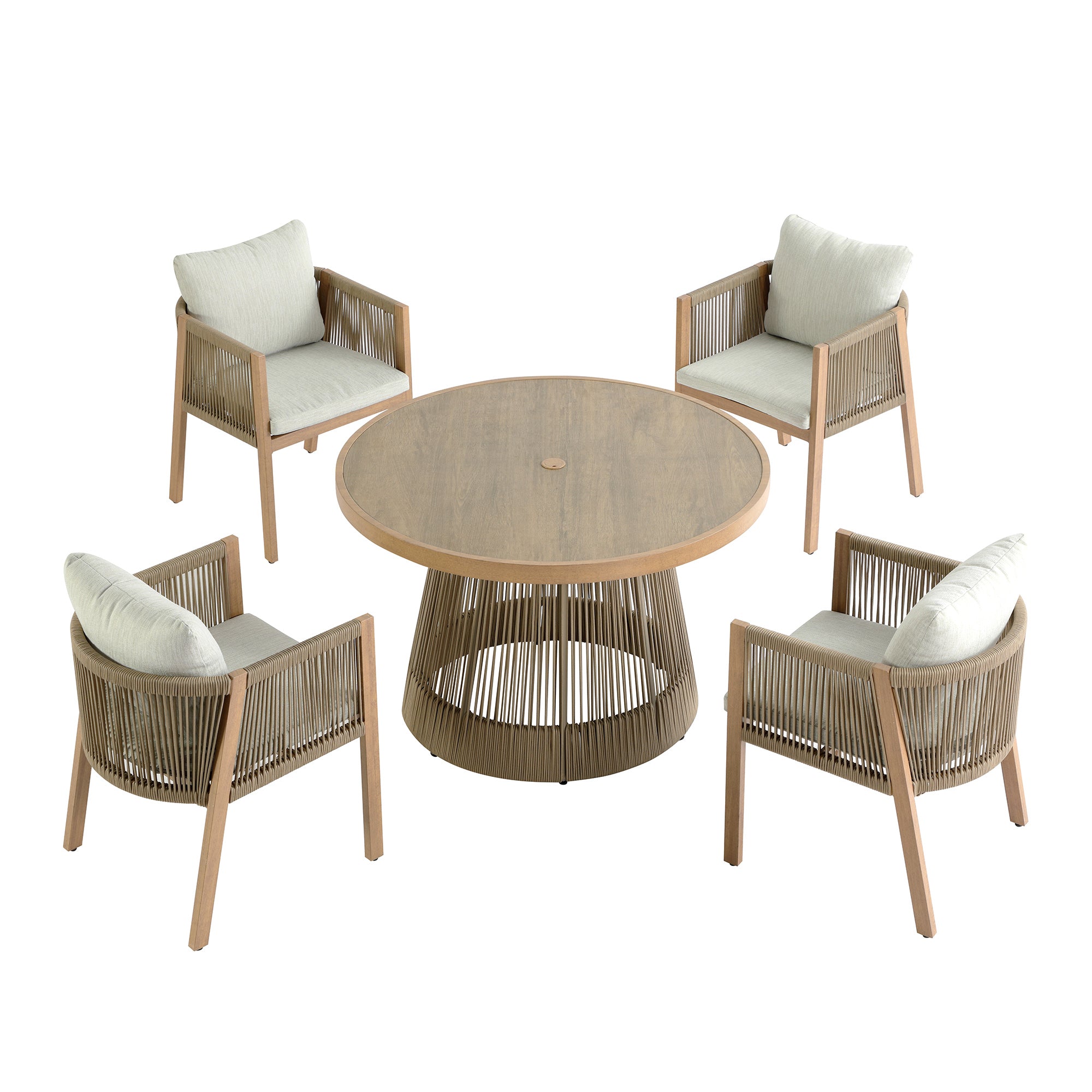 - Our Pedra Rope and Aluminium 4-Seater Round Dining Set comprises of a 110cm round dining table and 4 dining chairs.