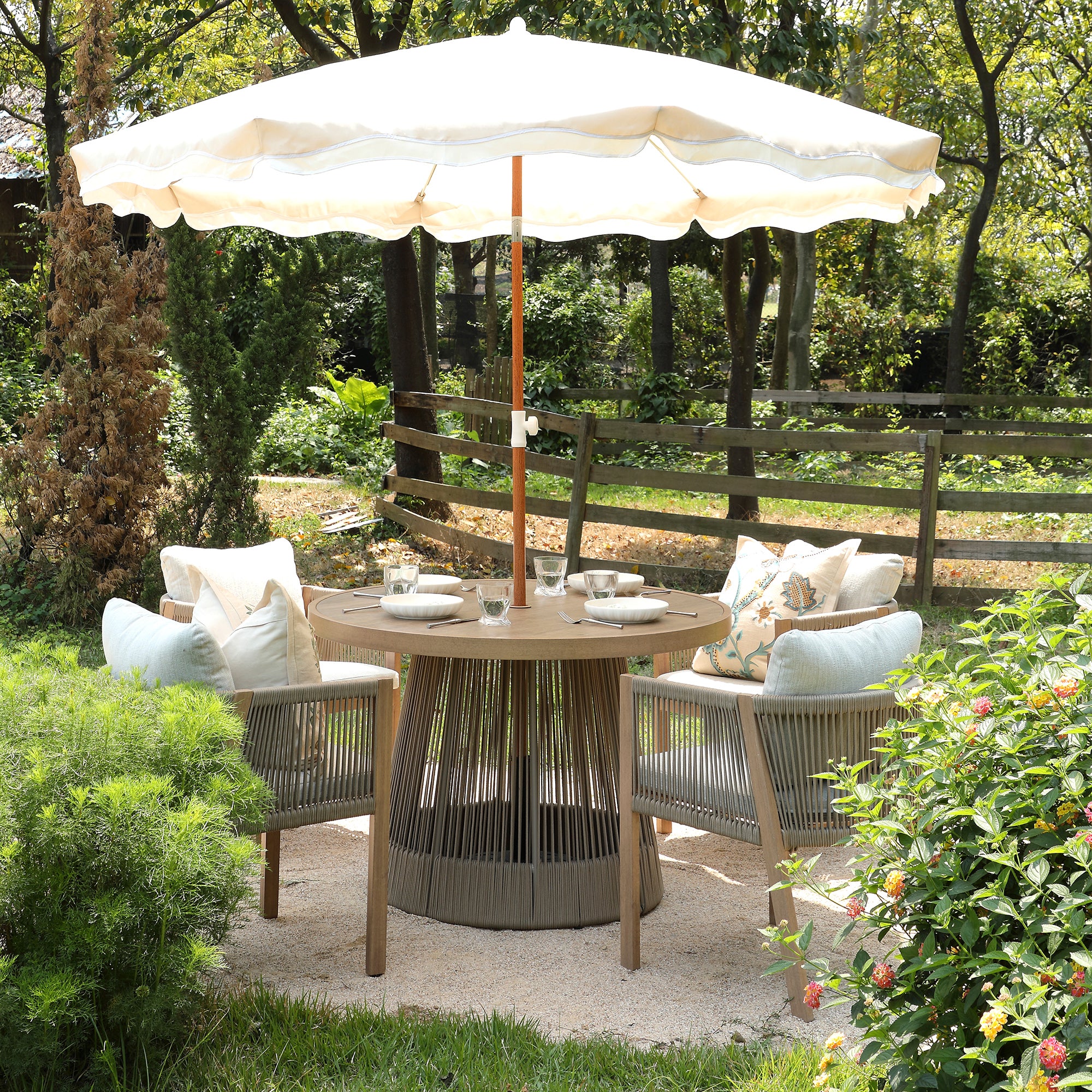 - Complete the look: Pictured with the Pedra Rope and Aluminium Outdoor 4-Seater Round Dining Set, Natural, is our Flora & Fauna Tree Of Life Cushion.