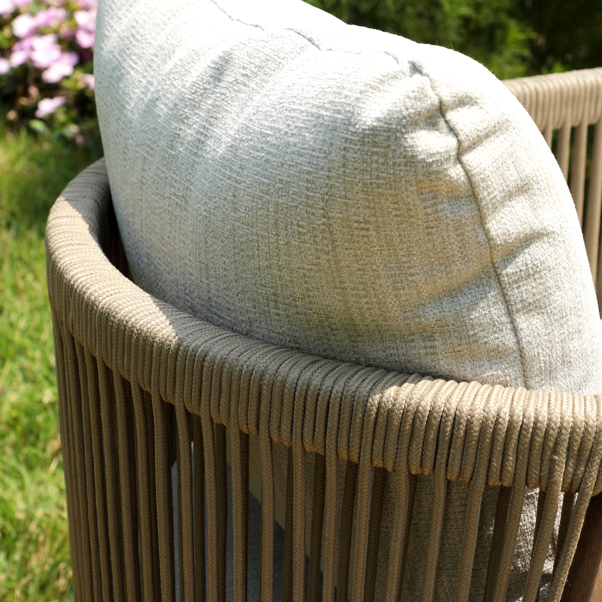 - Crafted from sturdy aluminium frame entwined with a 6mm hard-wearing fishbone weave rope, the dining set offers sumptuous seat and back cushions, making it perfect for comfortable and stylish outdoor seating.