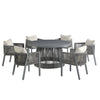 - Crafted from sturdy aluminium frame entwined with a 6mm hard-wearing fishbone weave rope, the dining set offers sumptuous seat and back cushions, making it perfect for comfortable and stylish outdoor seating.