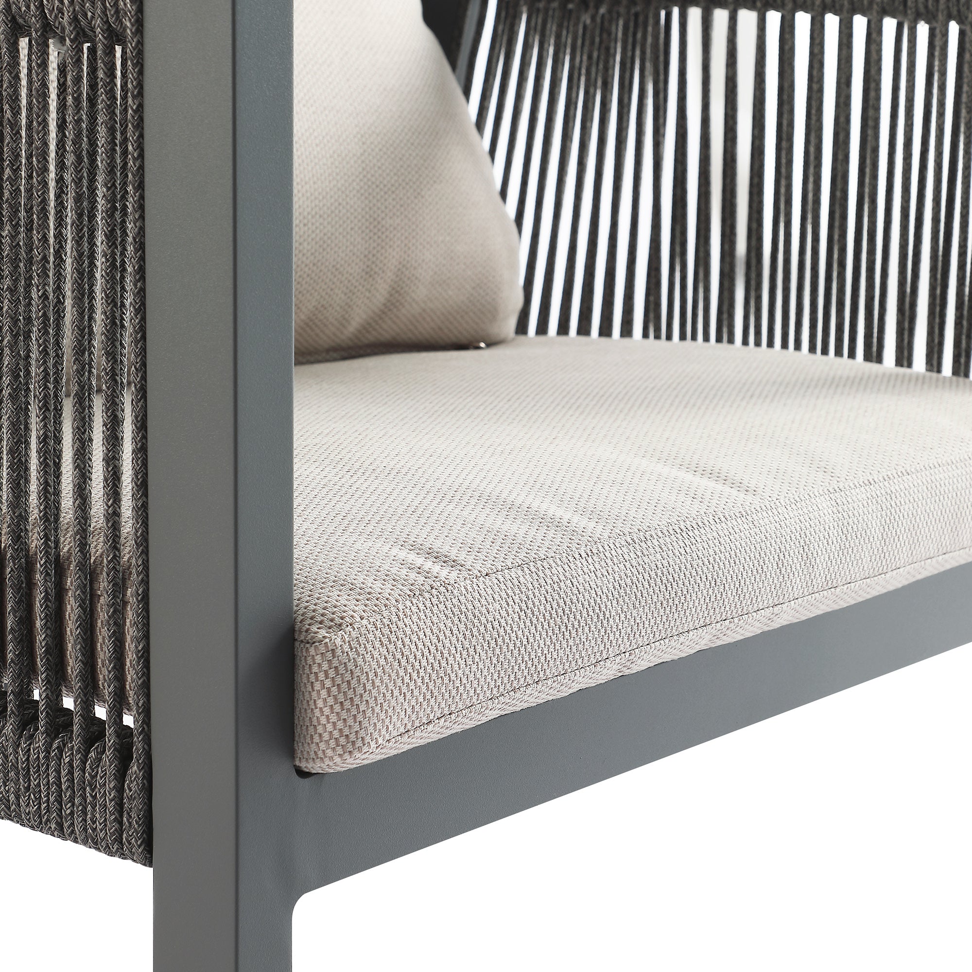 • Amply padded back and seat cushions are upholstered with UV resistant beige woven fabric to coordinate the grey powder-coated aluminium frame.