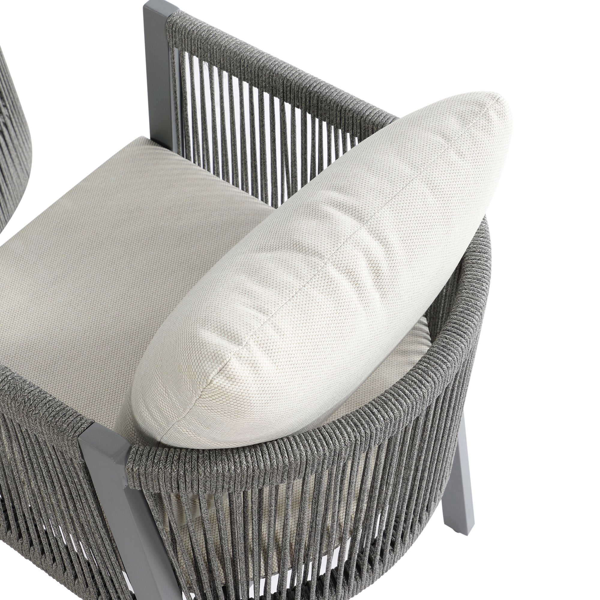 • Crafted from sturdy aluminium frame entwined with a 6mm hard-wearing fishbone weave rope, the dining set offers sumptuous seat and back cushions, making it perfect for comfortable and stylish outdoor seating.
