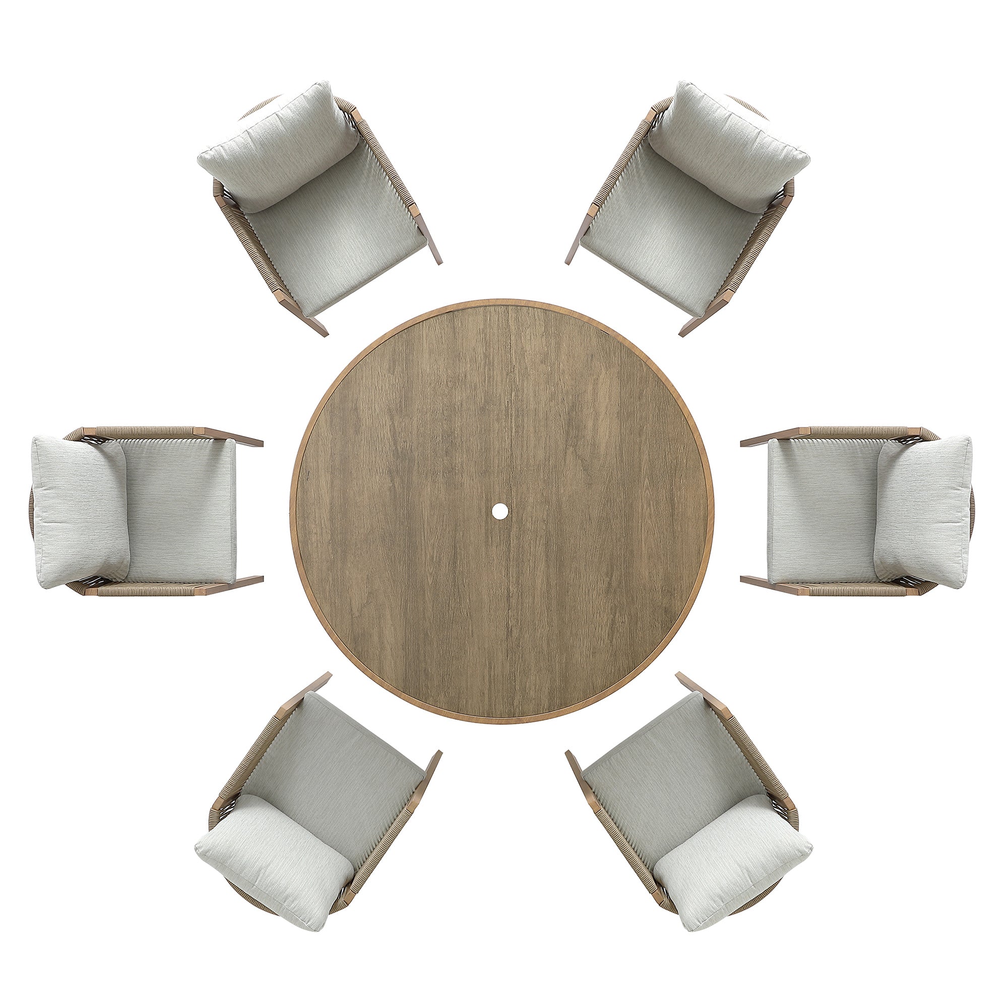 - Our Pedra Rope 6-Seater Round Dining Set comprises of a 135cm round dining table and 6 dining chairs.