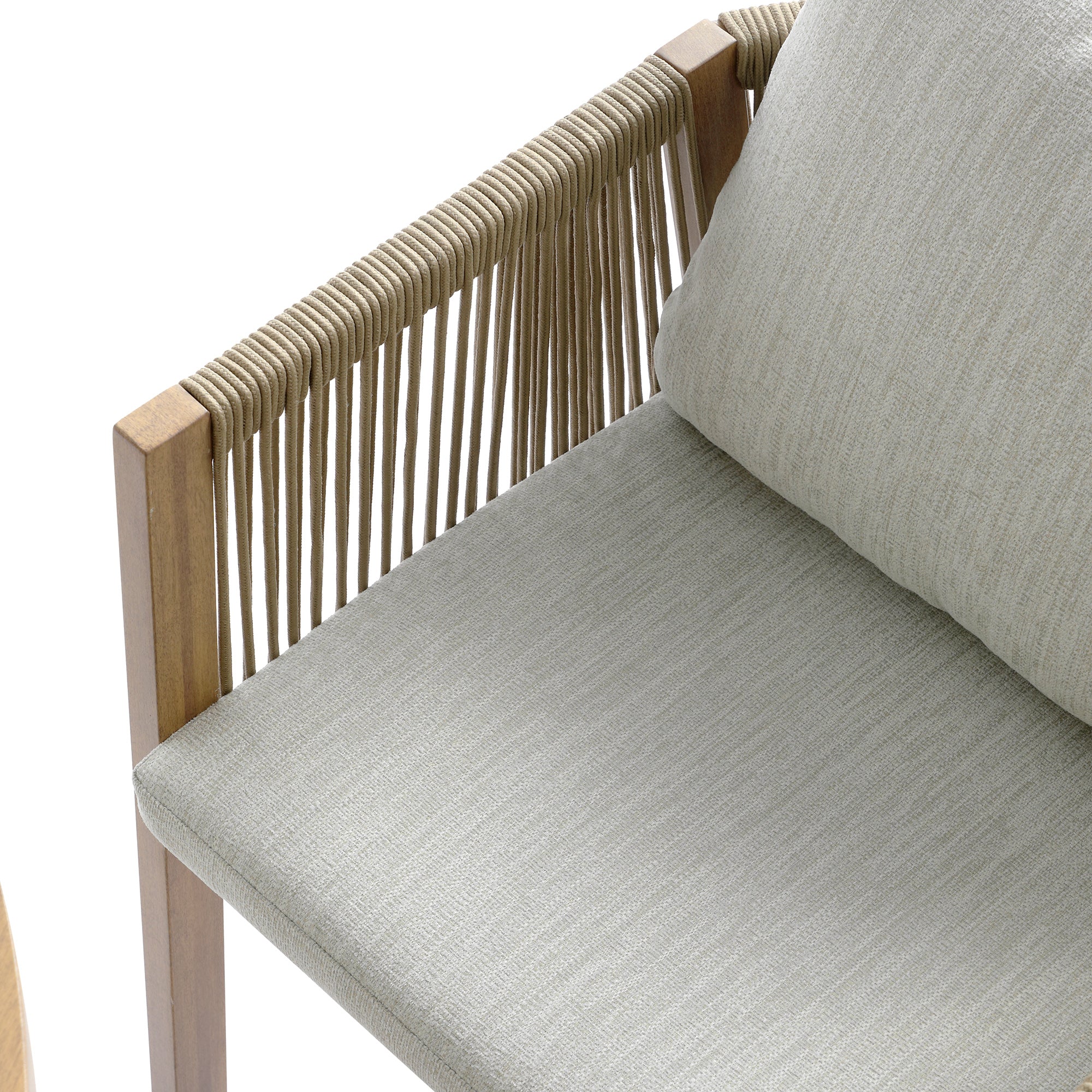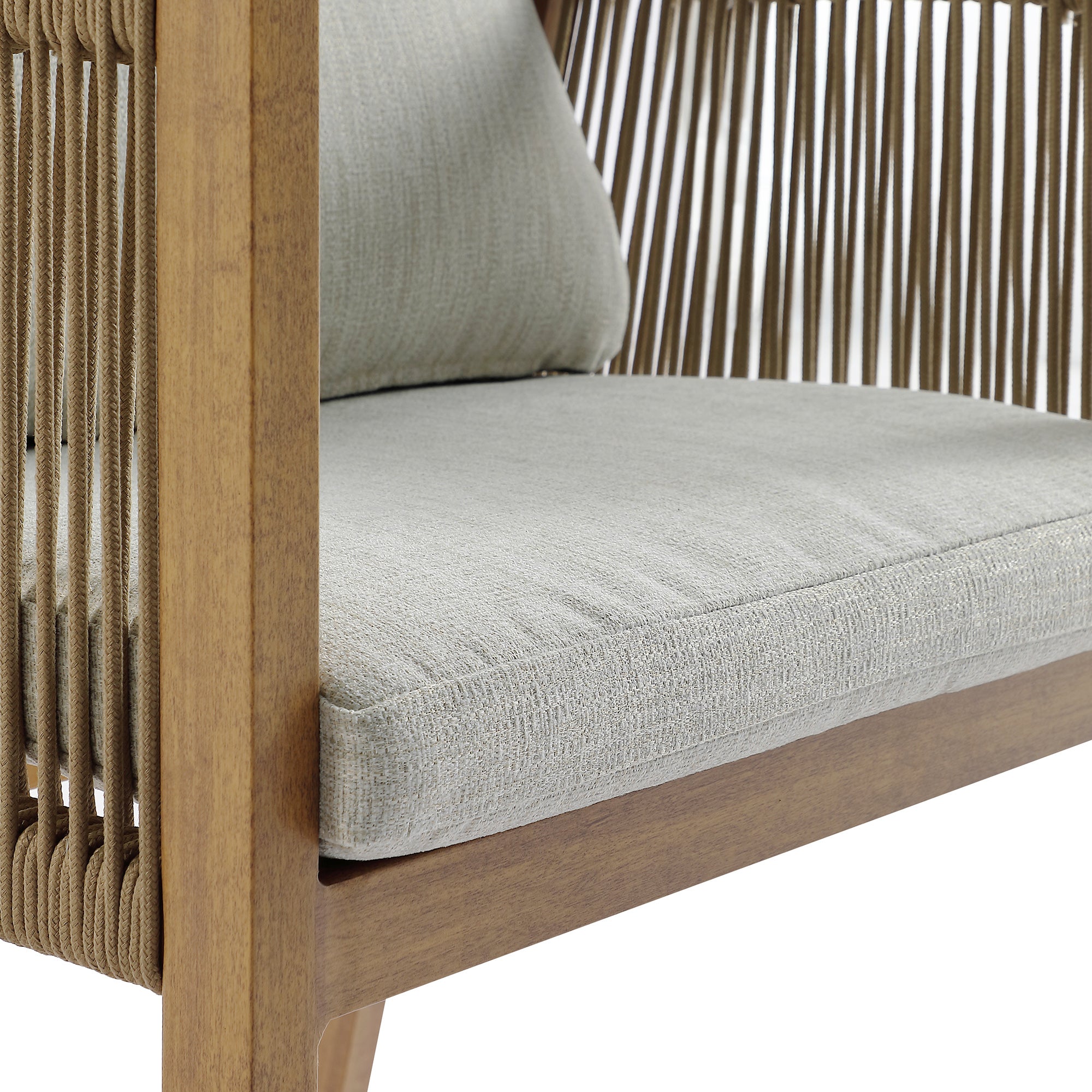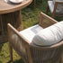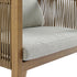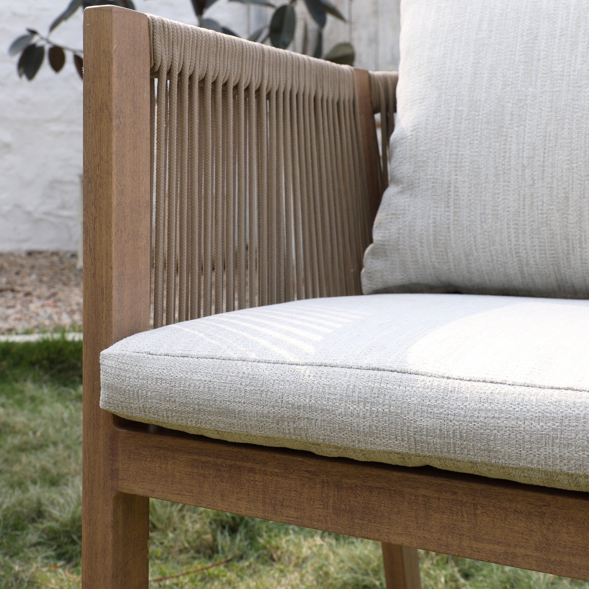 - Amply padded back and seat cushions are upholstered with UV resistant textured light grey fabric to coordinate the beautiful natural wood effect aluminium frame.