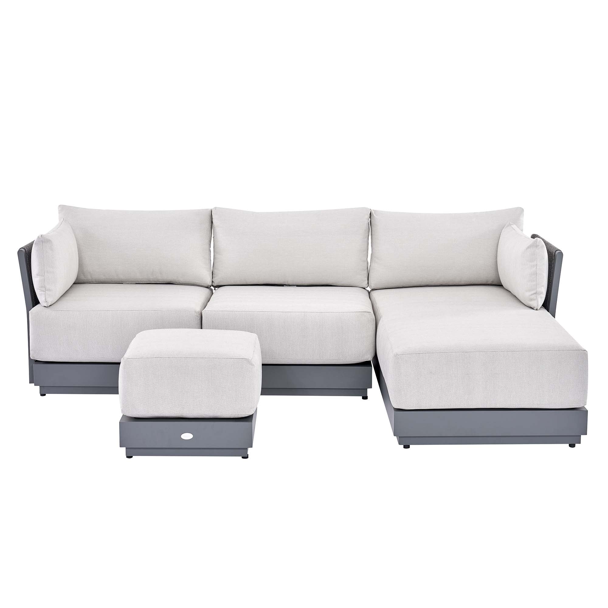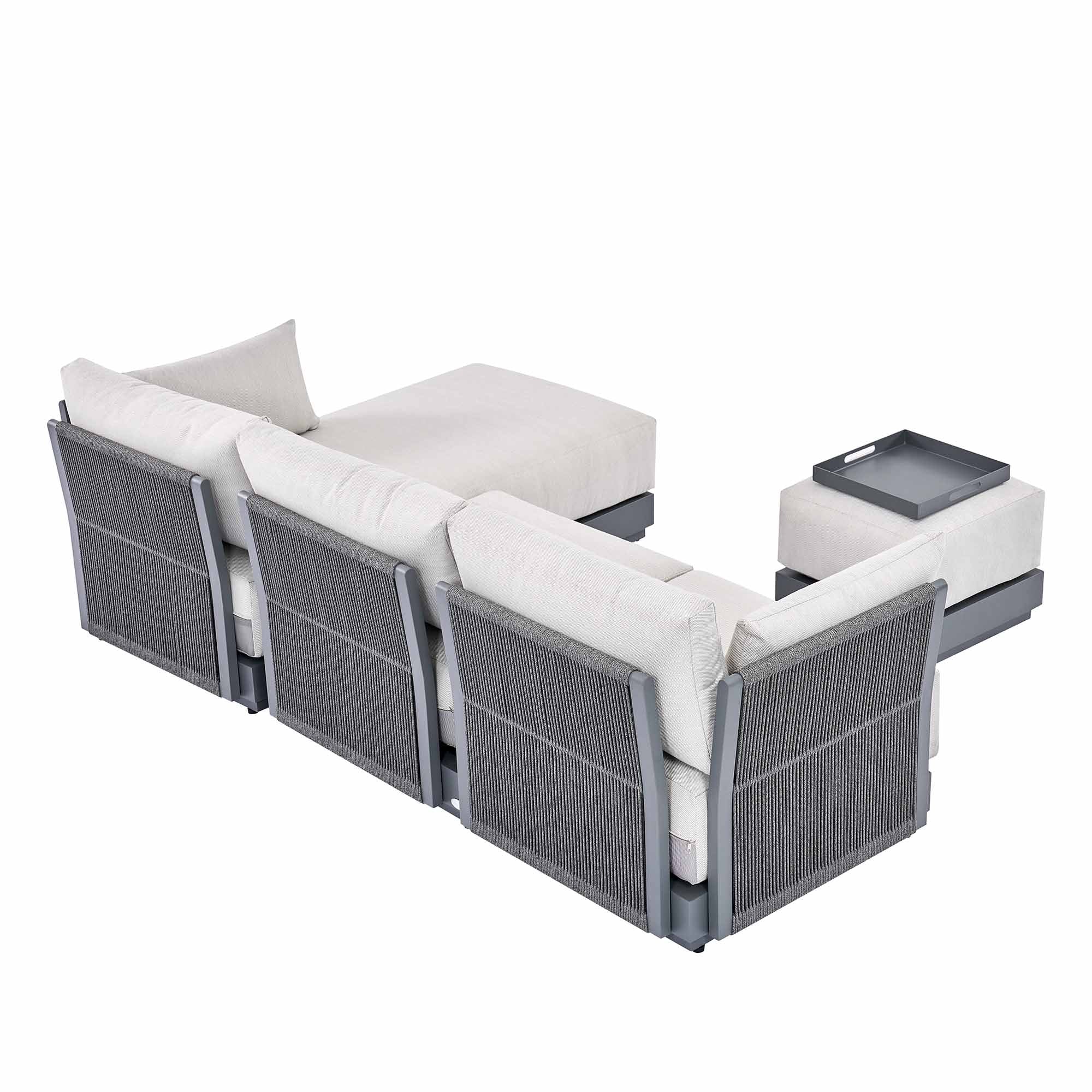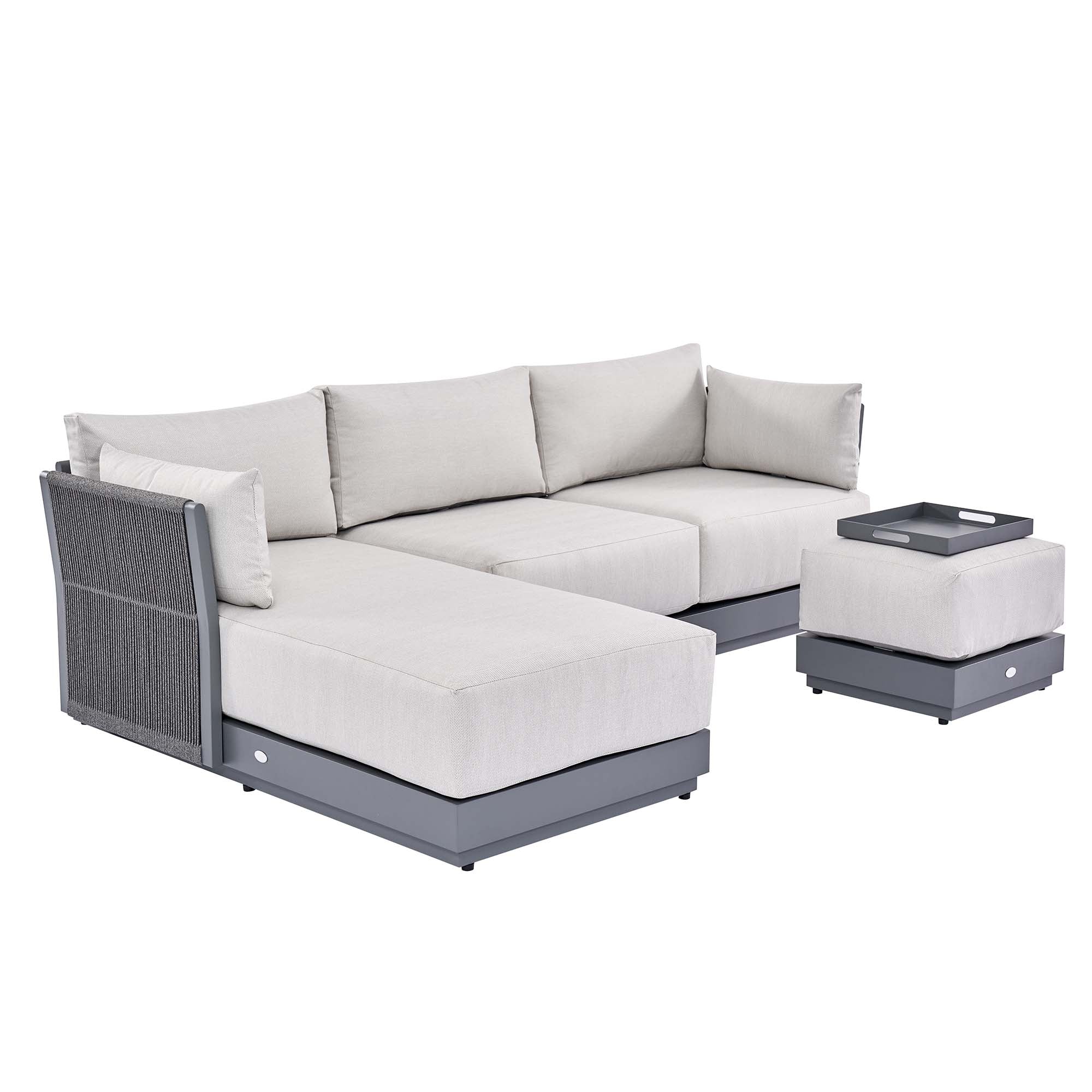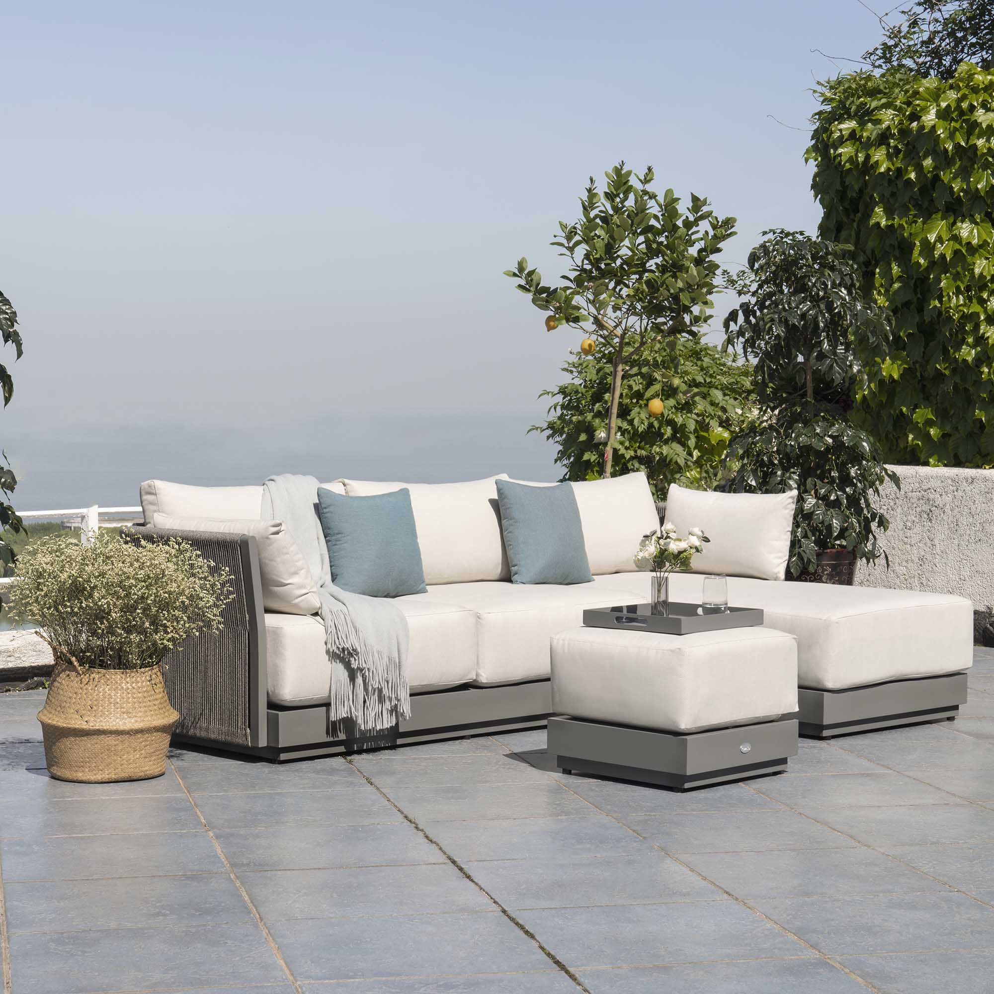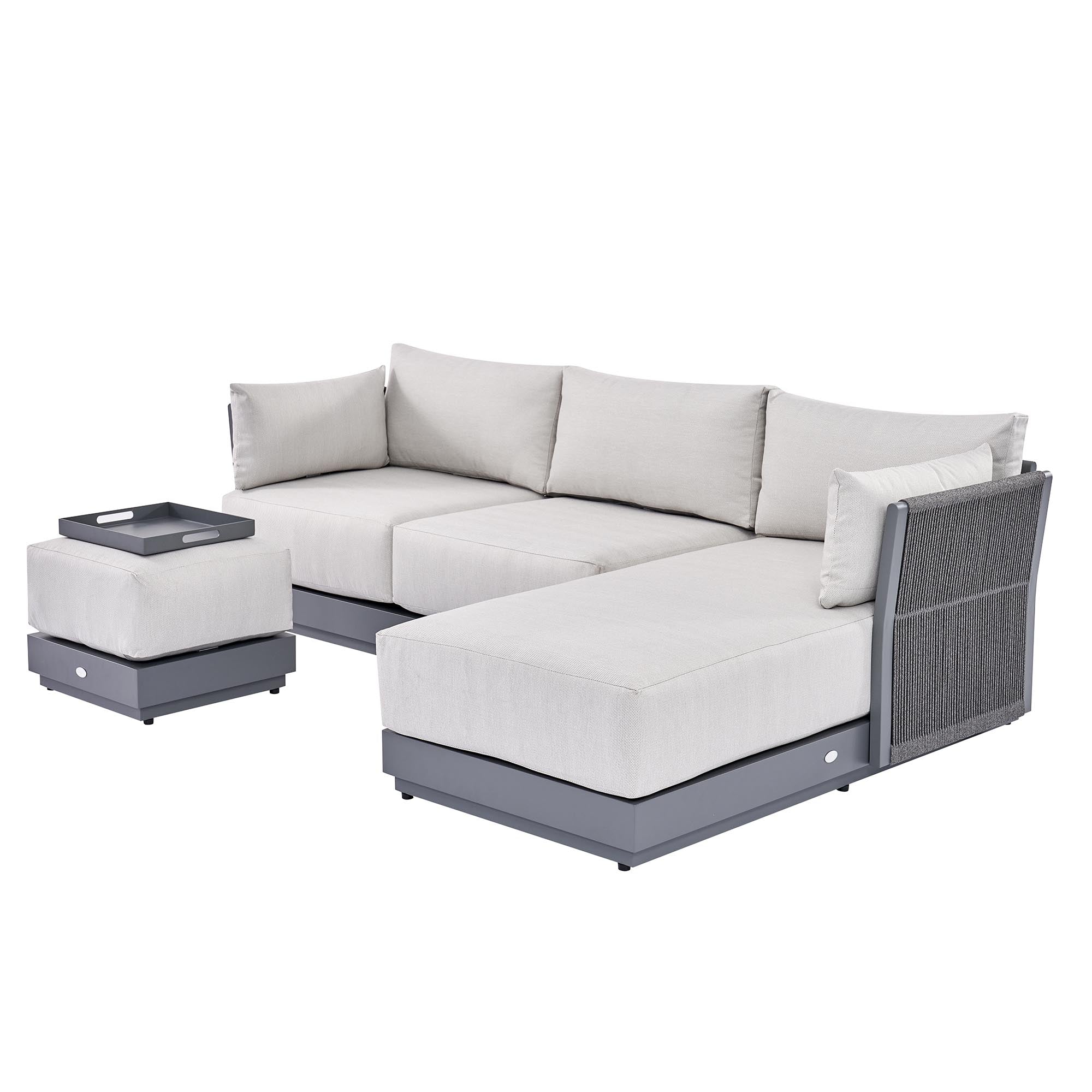 • Our Pedra Rope and Aluminium Chaise sofa set comprises of a two-seater sofa, a chaise, and a stool/coffee table with removable tray