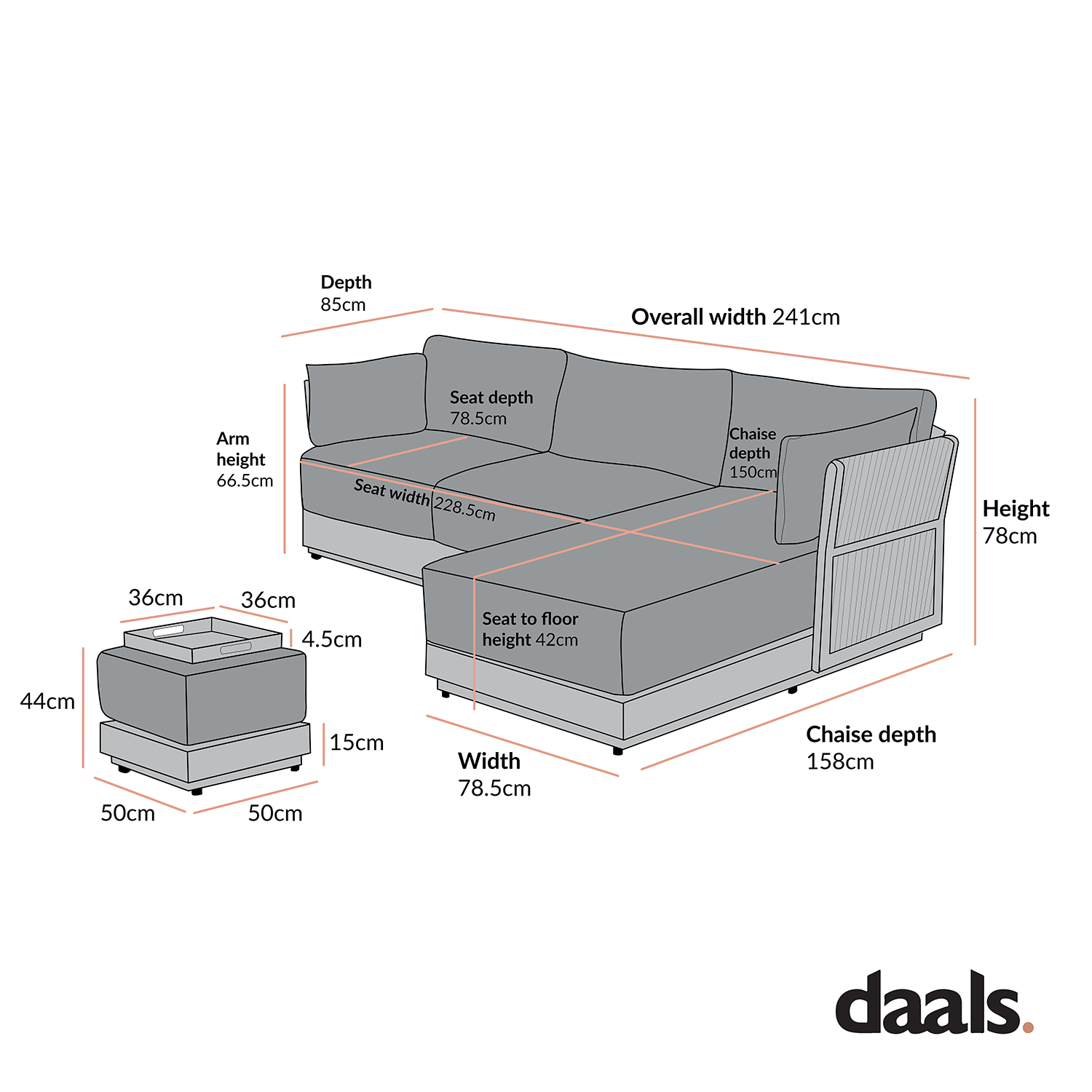 • Footstool: W 50 x D 50 x H 44 cm