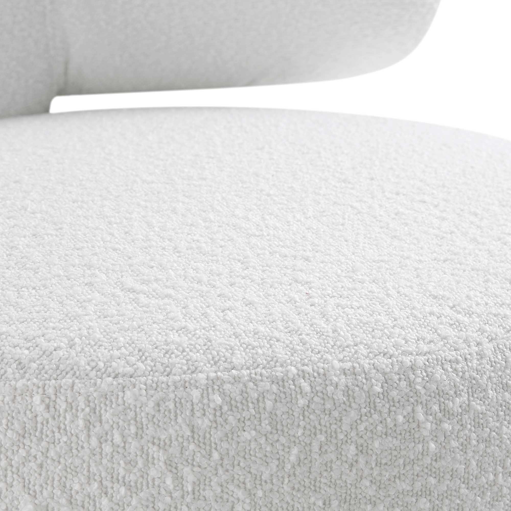 - Chunky seat is well cushioned and upholstered with textured white boucle fabric, paired with slim metal legs finished in matte black for a sophisticated look.