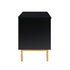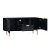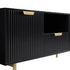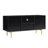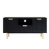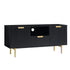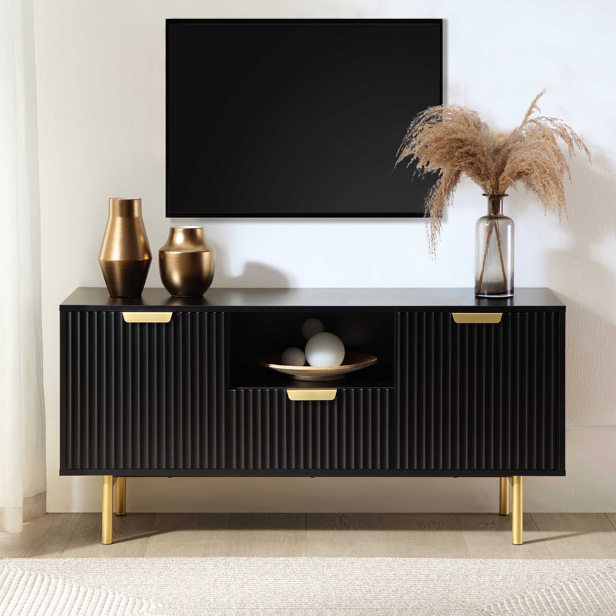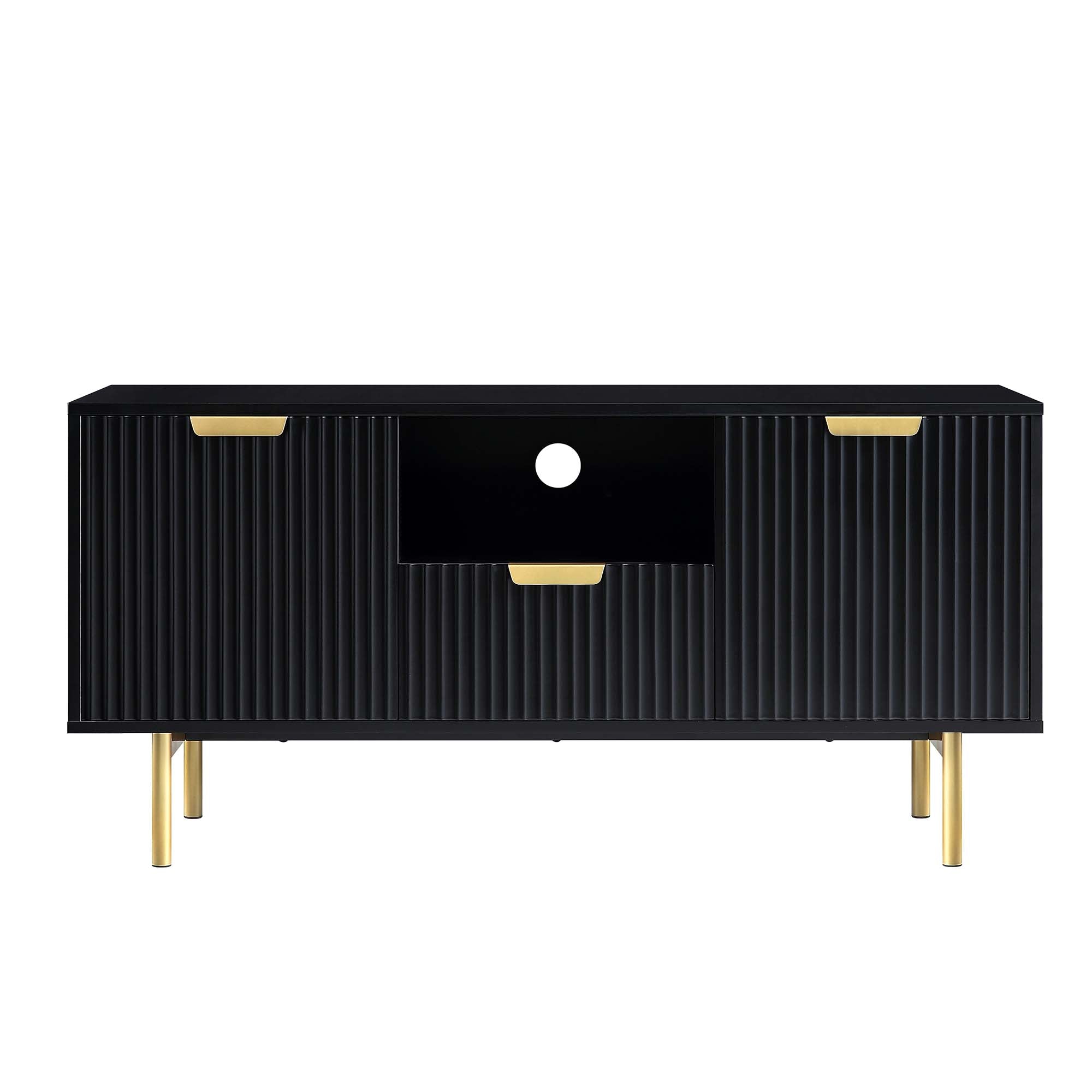 - The 120 cm wide TV unit features ribbed front finished in matte black paint, completed with contrasting gold effect handles and legs.