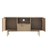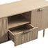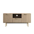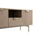- The 120 cm wide TV unit features ribbed front finished in light stain, completed with contrasting gold effect handles and legs.