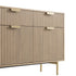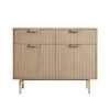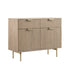 - The cabinet features a ridged surface on the doors and drawer fronts, finished in light shaded stain, contrasted by gold accents on the handles and legs.
