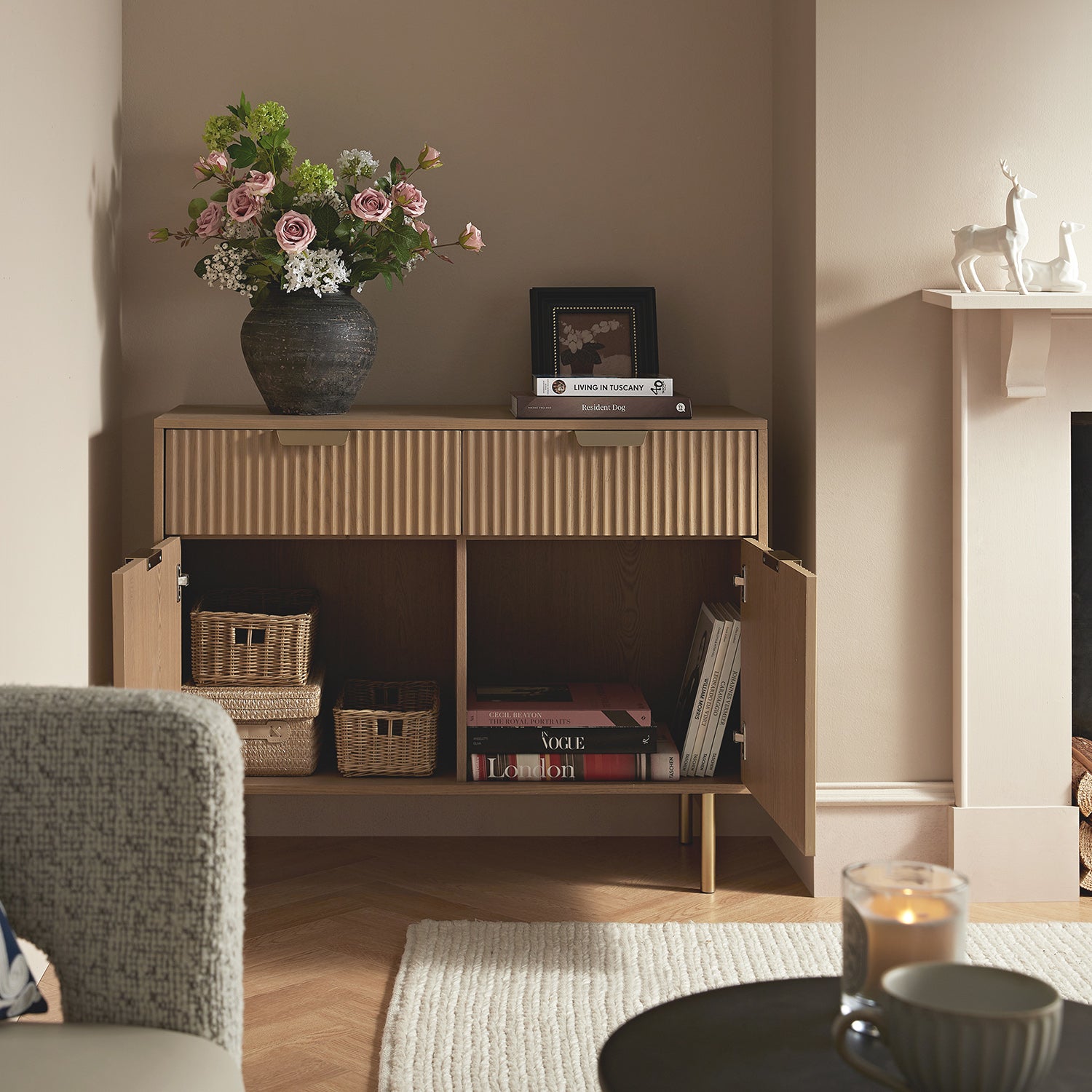 - Complete the look: Pictured with the Richmond Light Ash Ridged 2-Door Cabinet with Drawers is our Greenwich Taupe Boucle & Beige Faux Leather Seat Dining Chair, Aurora Hand Braided Cream Jute Rug and Maru Black Oak Round Side Table.