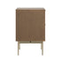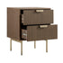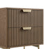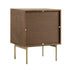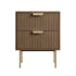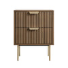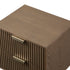 - The cabinet features ridged door surface in dark tone stain, paired with gold handles and legs.