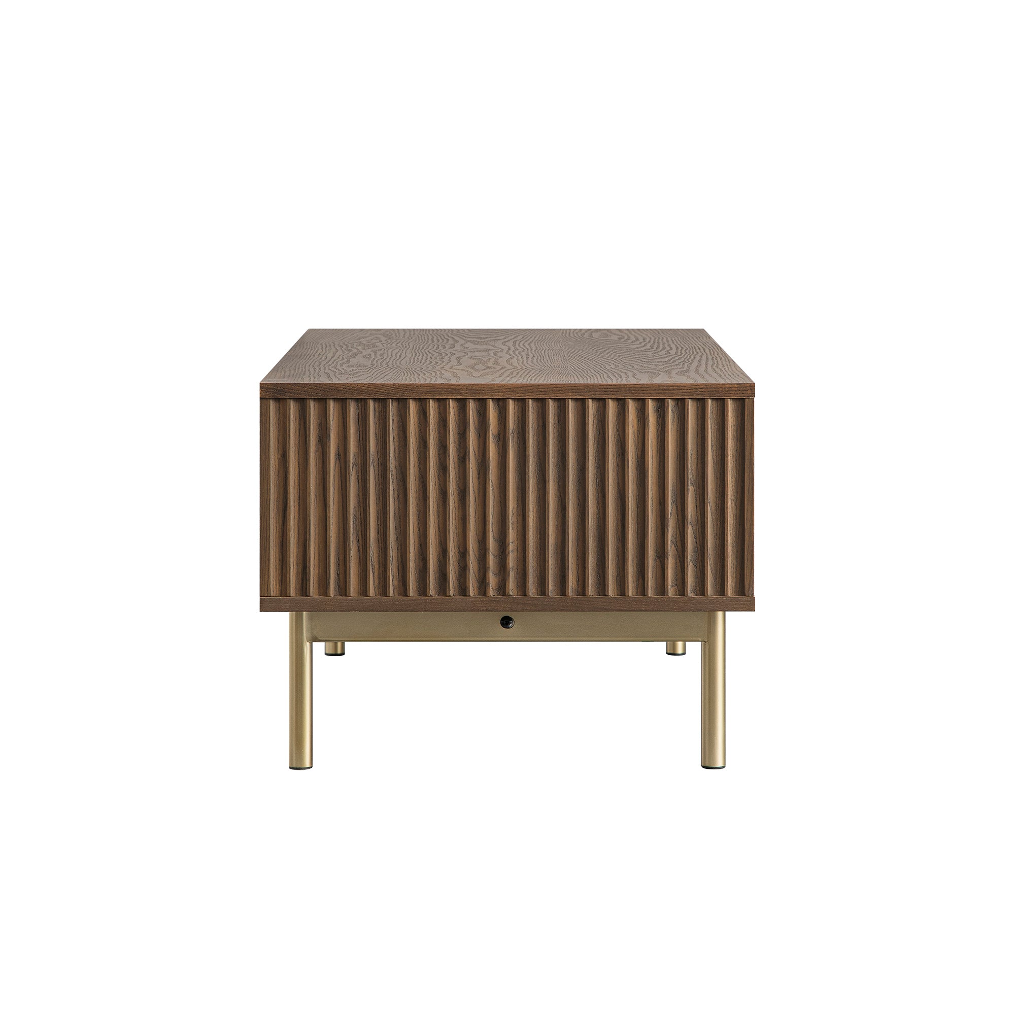• With a ridged finished in dark shade stain, the coffee table is further enhanced by the gold drawer handle and legs.