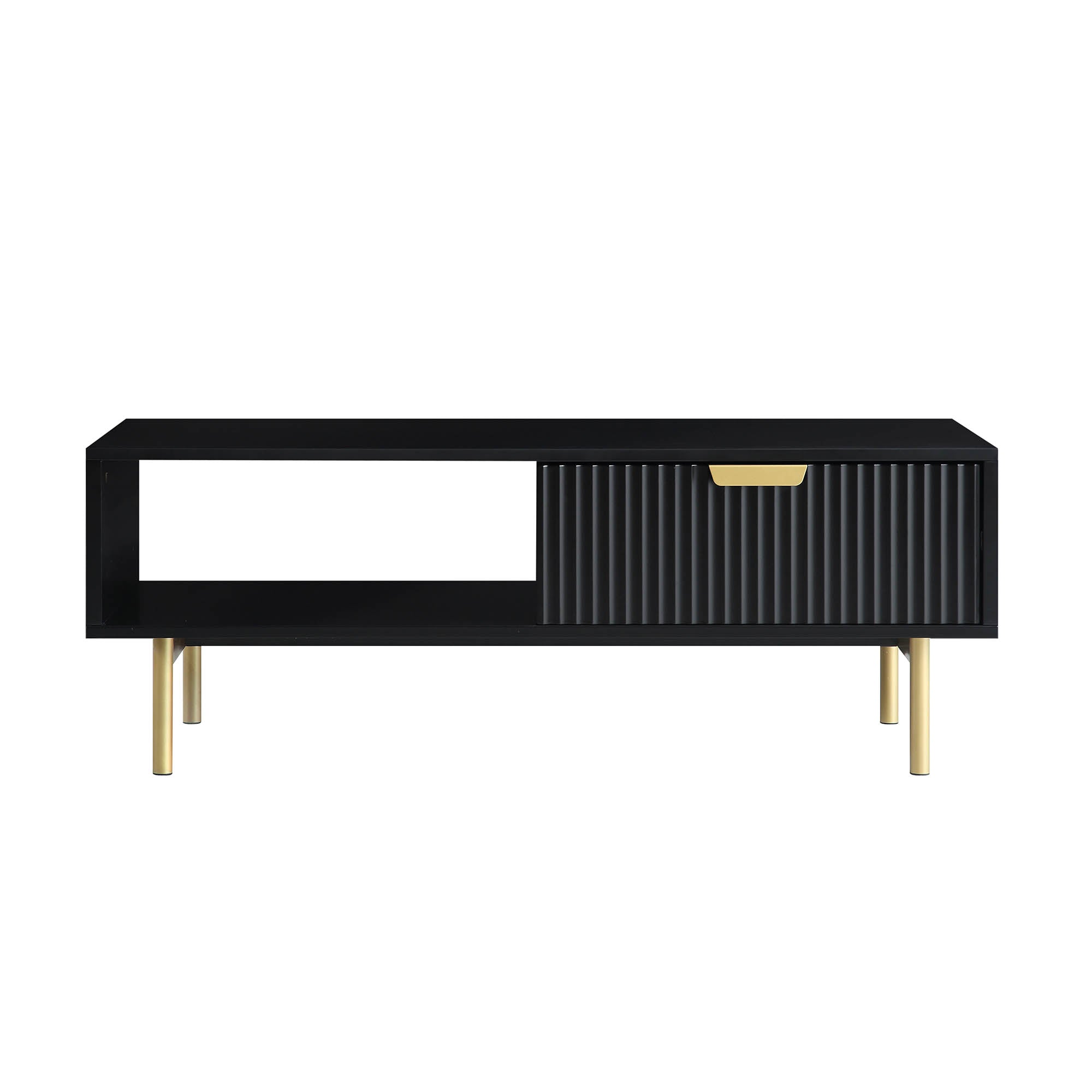 - With a ridged finished in matte black paint, the coffee table is further enhanced by the gold drawer handle and legs.
