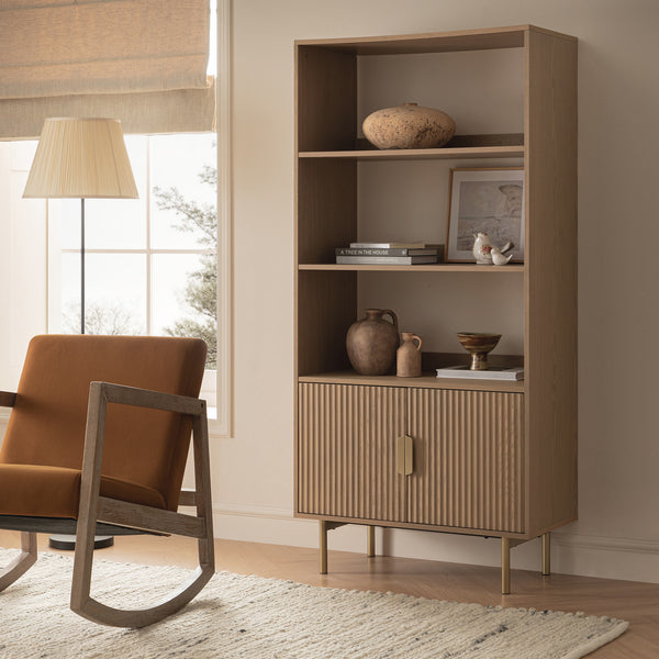 - Complete the look: Pictured with the Richmond Light Ash Ridged Tall Bookcase is our Fyne Cinnamon Velvet Oak Rocking Armchair and Indra Light Grey Handwoven Wool Rug.