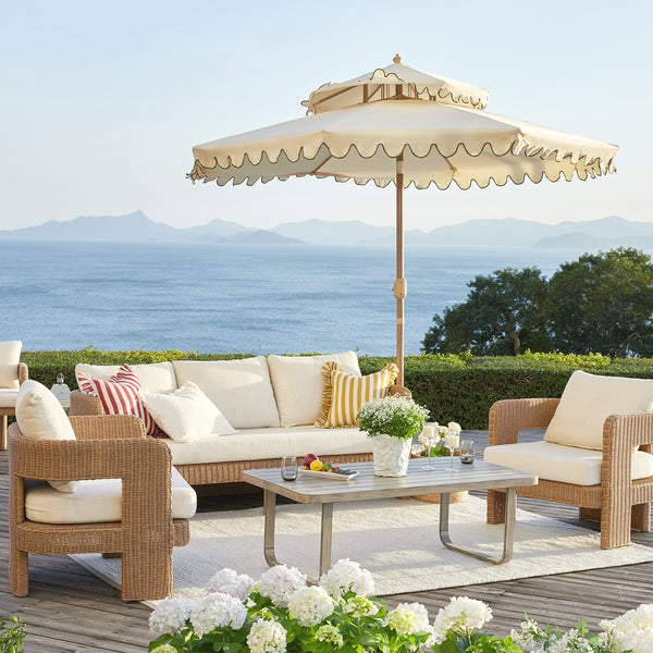 Complete the look: Pictured with the Stanford Natural Round Wicker Outdoor 5-Seater Sofa Set is our Fabienne Beige 3M Octagonal Double Top Crank & Tilt Parasol with Green Scalloped Edge, Aurora Cream Outdoor Hand Braided PET Rug, Kyra Cream White Bouclé Fringed Rectangular Cushion and Eliza Striped Ruffle Linen Blend Cushion in scarlet red and dark mustard.