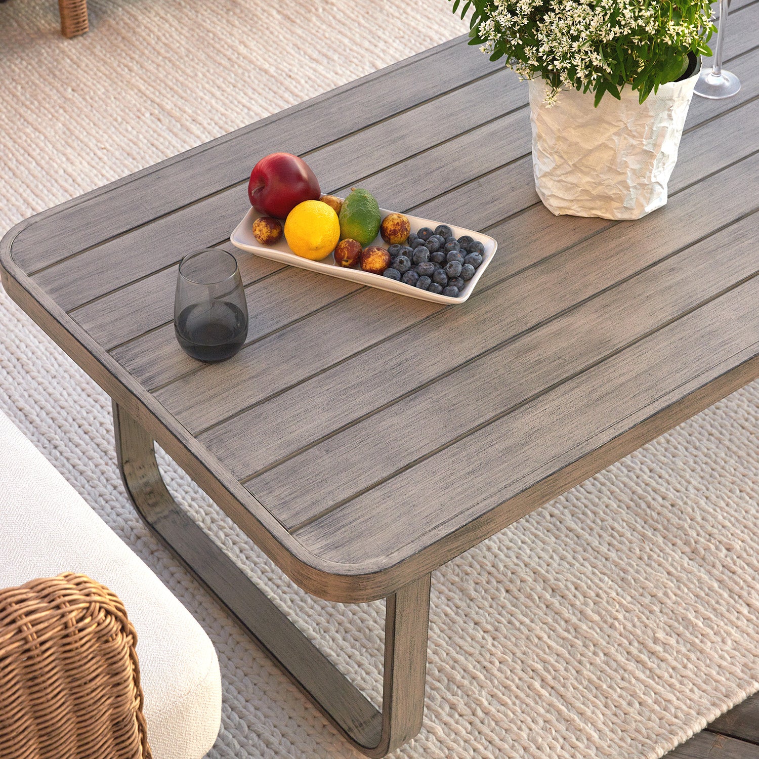 - Crafted from hand-painted aluminium, the large 135 x 70 cm coffee table features slatted table top design with U-shaped legs in a weathered-wood effect finish to match the wicker seatings.
