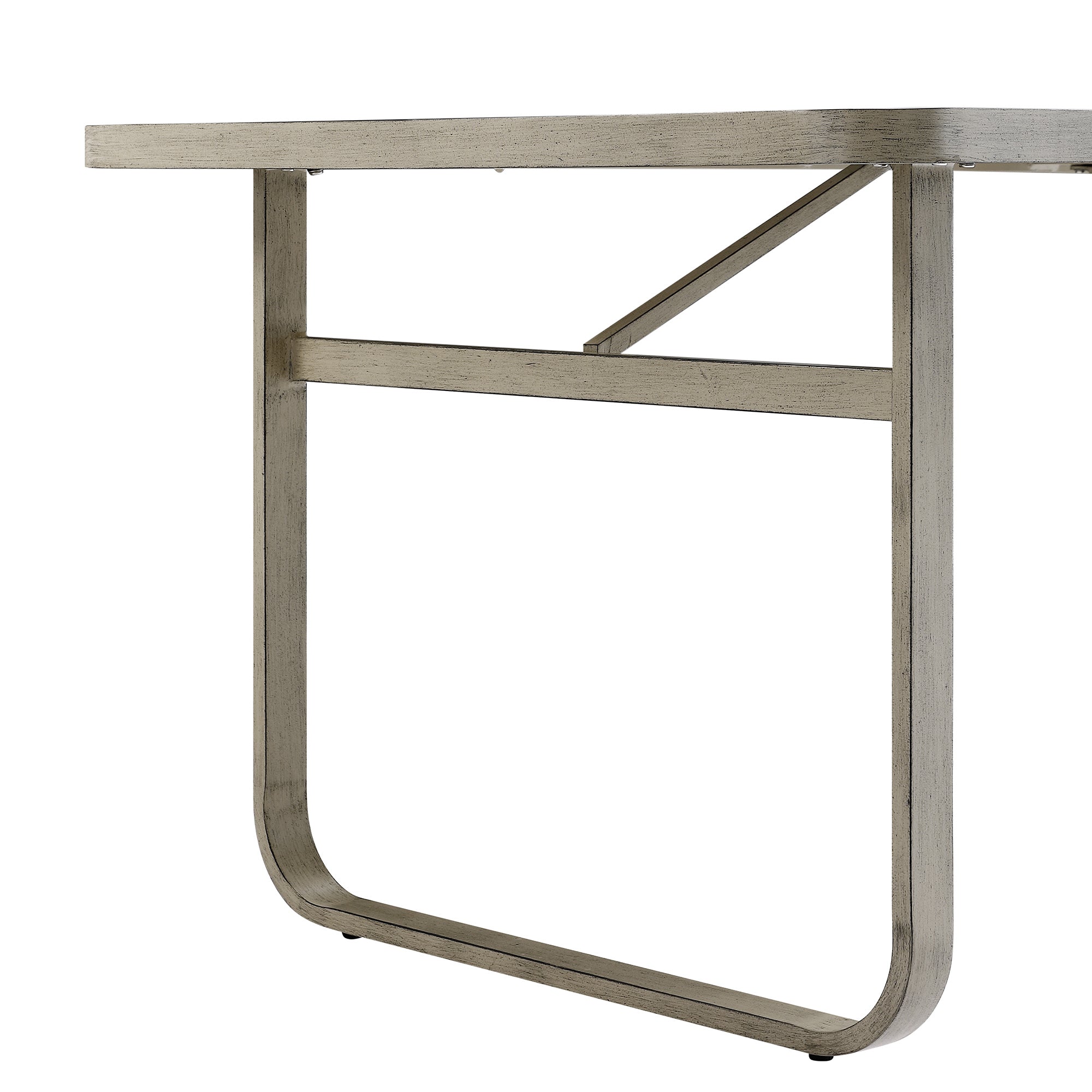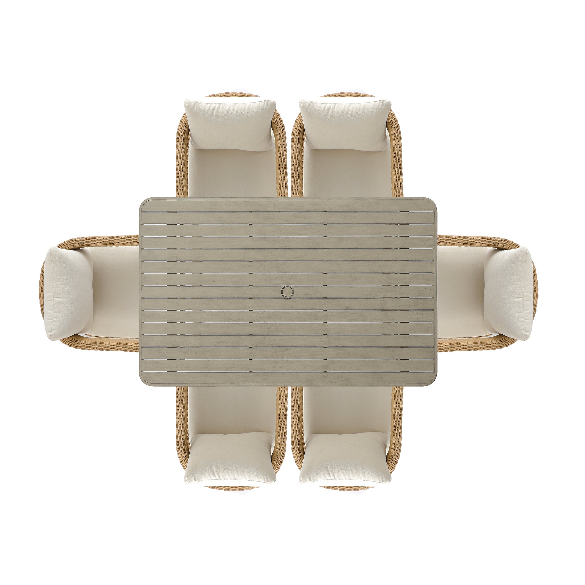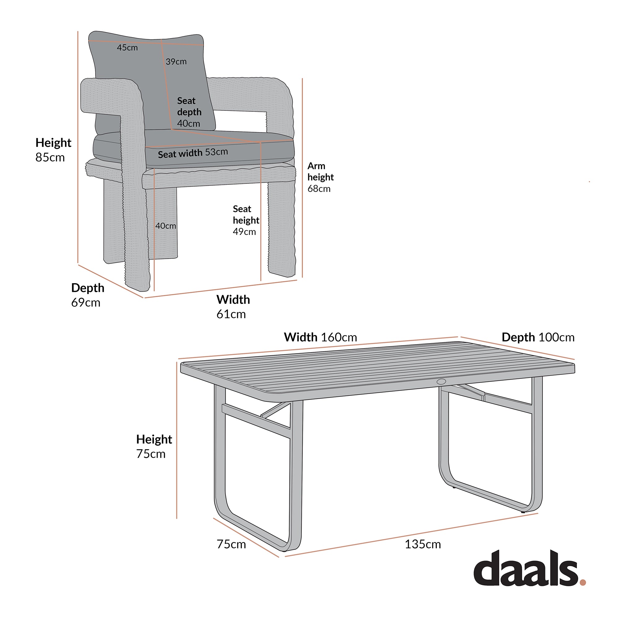 - Crafted from hand-painted aluminium, the large 160cm wide rectangular dining table features slatted table top design with U-shaped legs in a weathered-wood effect finish to match the wicker chairs.