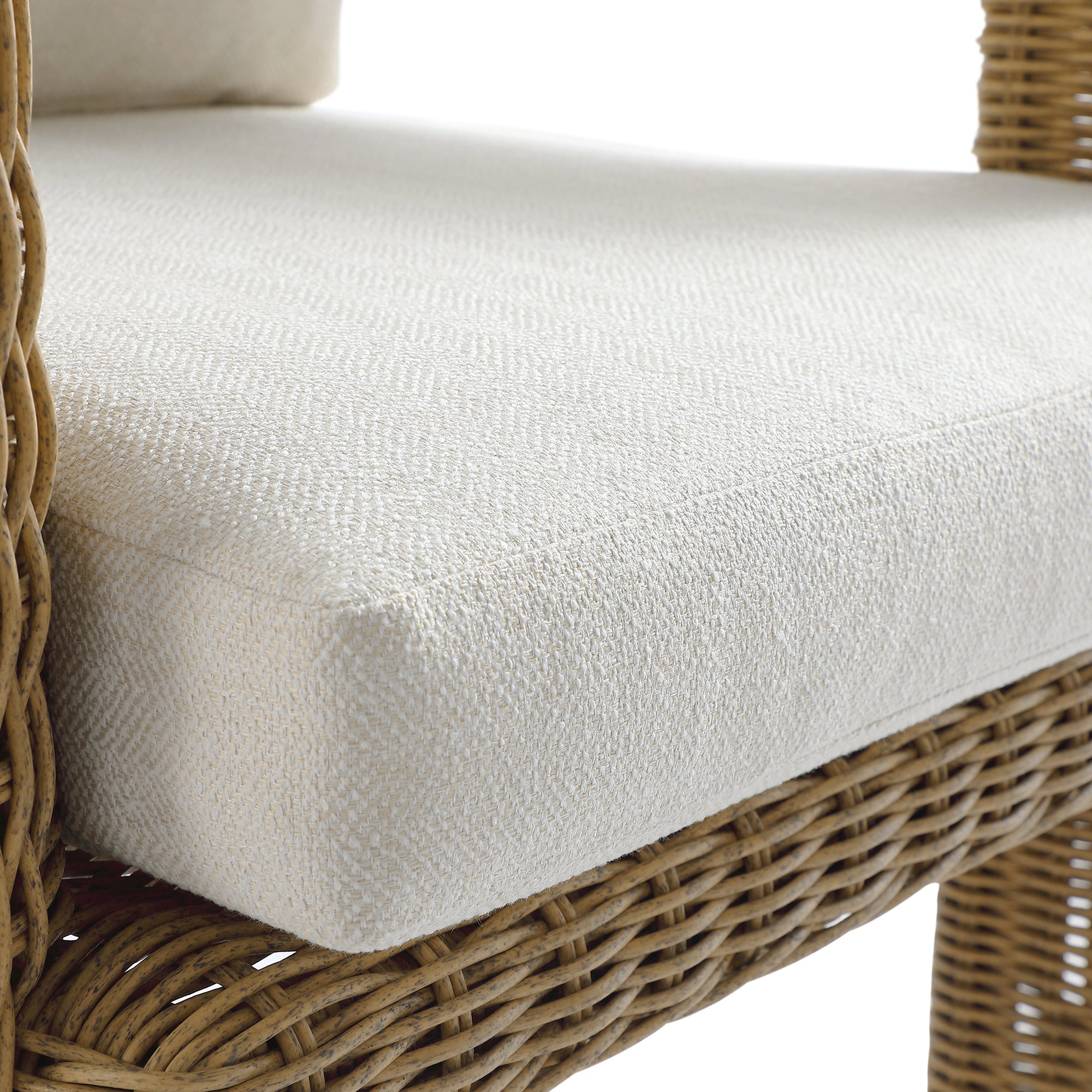 - Featuring a curved sculptural silhouette, the dining chairs are crafted from durable rust-resistant aluminium internal frame with handwoven all-weather round wicker, creating a perfect balance of strength and elegance.