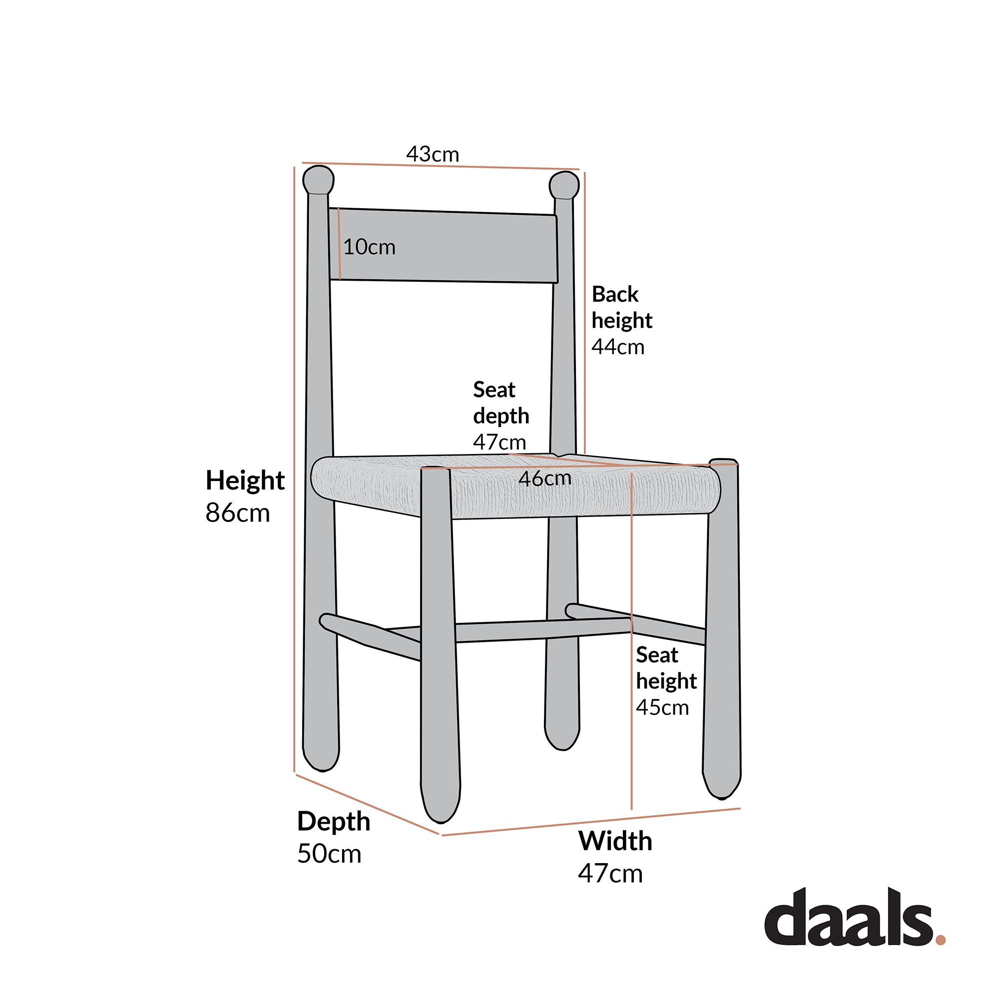 - Size: W 47 x D 50 x H 86 cm. Seat height: 45 cm.