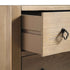 - Gently concave drawer fronts are complemented with the aged brass clove metal handles.