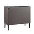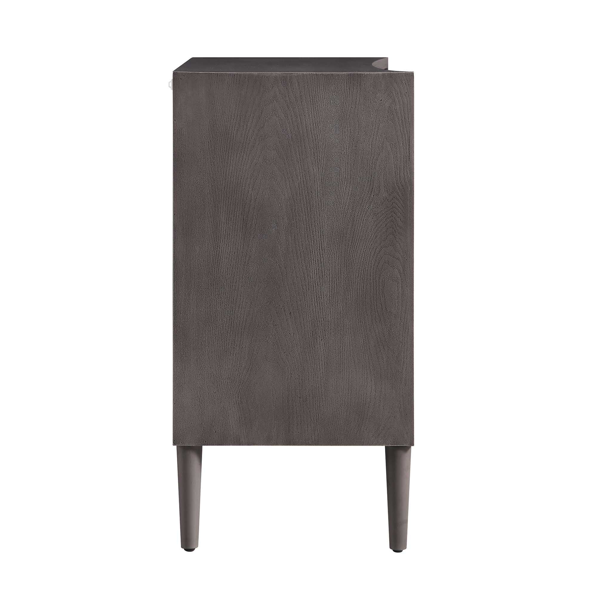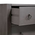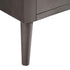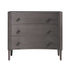- Gently concave drawer fronts are complemented with the aged brass clove metal handles.