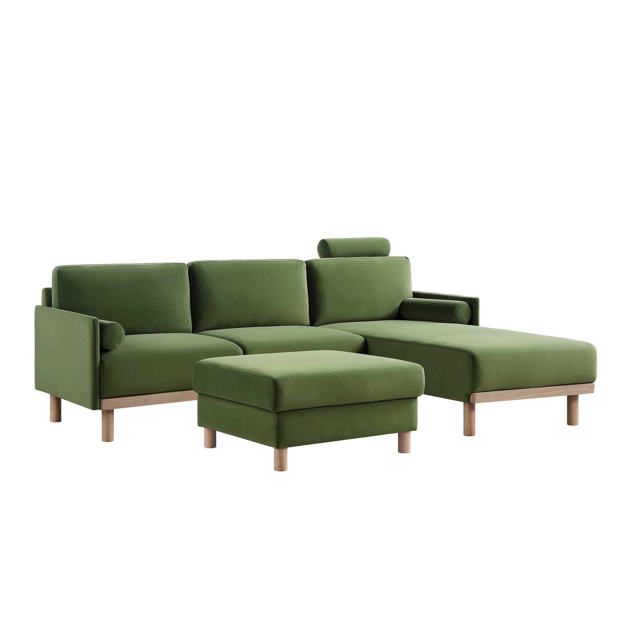 Timber Fern Green Velvet Sofa, Large 3-Seater Chaise Sofa Right Hand Facing
