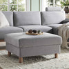 - With a solid wood internal frame, the ottoman has a solid wood base and cylindrical legs.