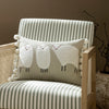 - The cushion features three charming sheep that stand out beautifully against the neutral beige background, with fluffy white pom poms finishing off the look.