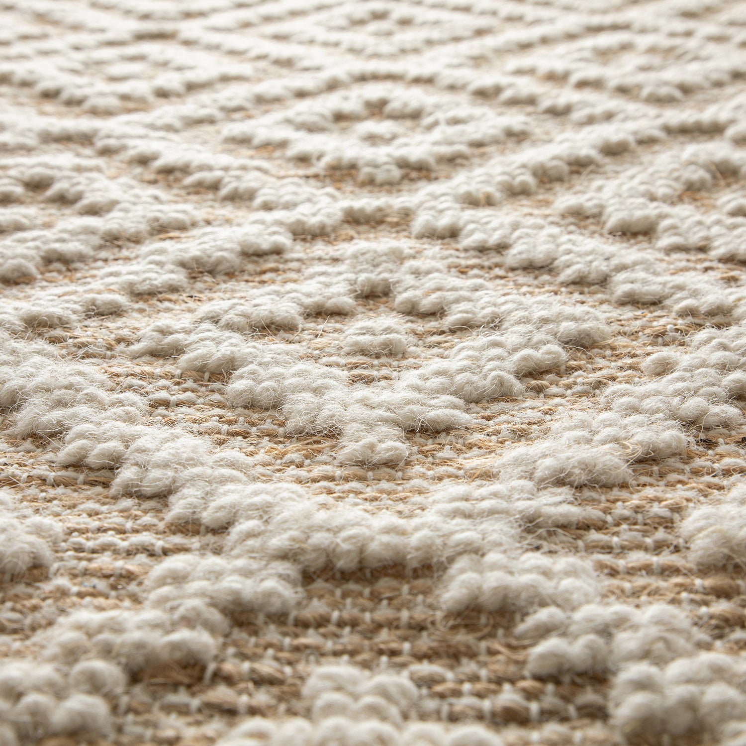 - A stunning diamond repeat pattern is crafted from raised ivory white wool, which beautifully contrasts the natural jute base. The geometric design adds visual interest and brings a sense of structure without overwhelming the space. While the juxtaposition of materials and colours adds depth and makes a subtle statement.