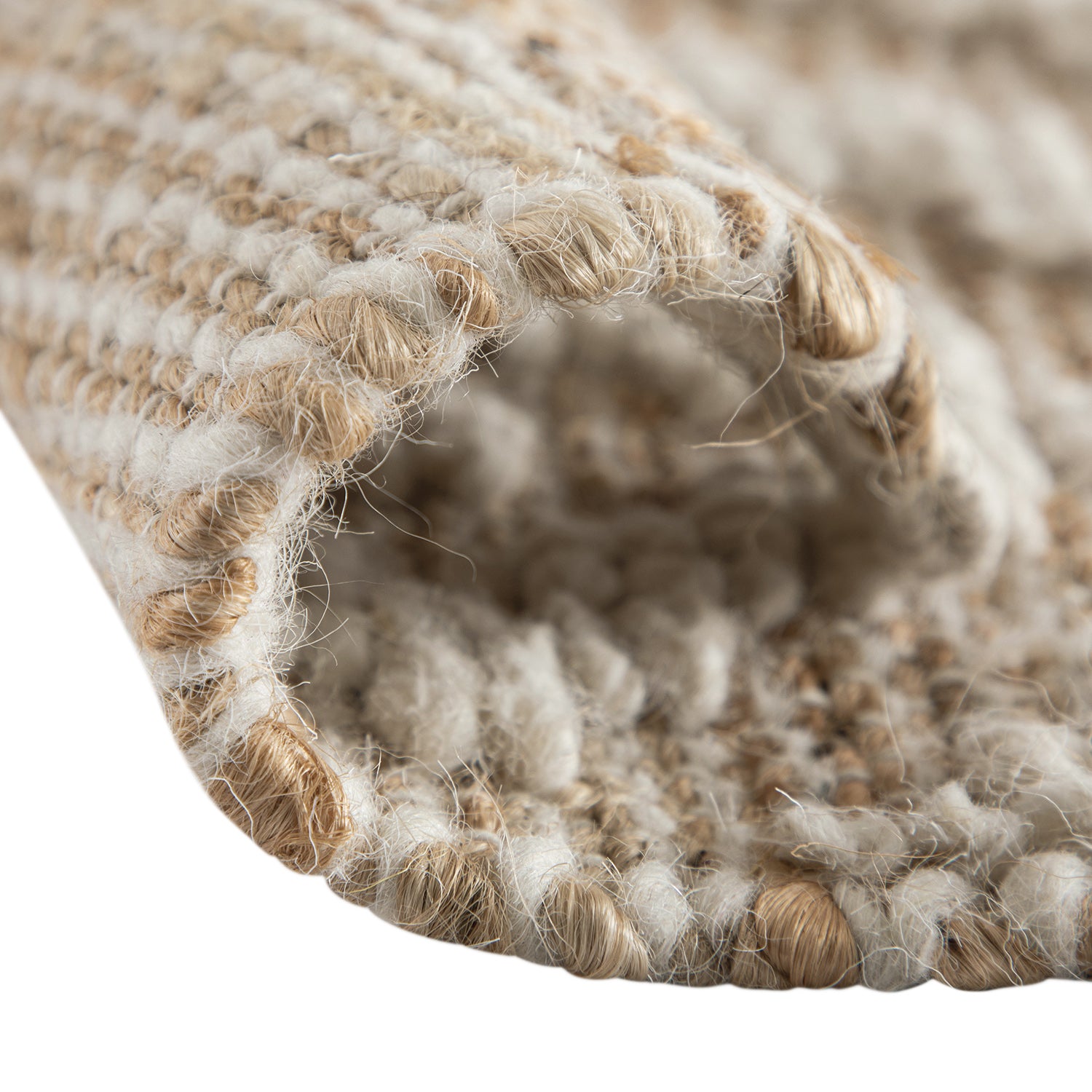 - The Veneta Natural & Ivory White Diamond Handwoven Wool & Jute Rug comes rolled and packaged in a clear sleeve.