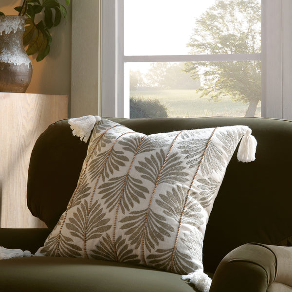- Forming part of our vine collection, this cushion is sure to add a touch of nature to your home decor, with its beautiful leaf design, featuring wooden beads, thick edge tassels and specialised couching stiches in thick cotton yarn.