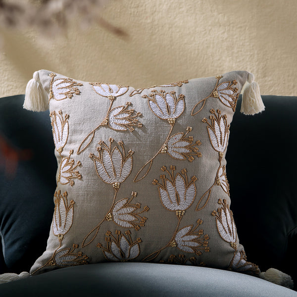 - Forming part of our vine collection, this cushion is sure to add a touch of nature to your home decor, with its beautiful floral design, featuring wooden beads, thick edge tassels and specialised couching stiches in thick cotton yarn.