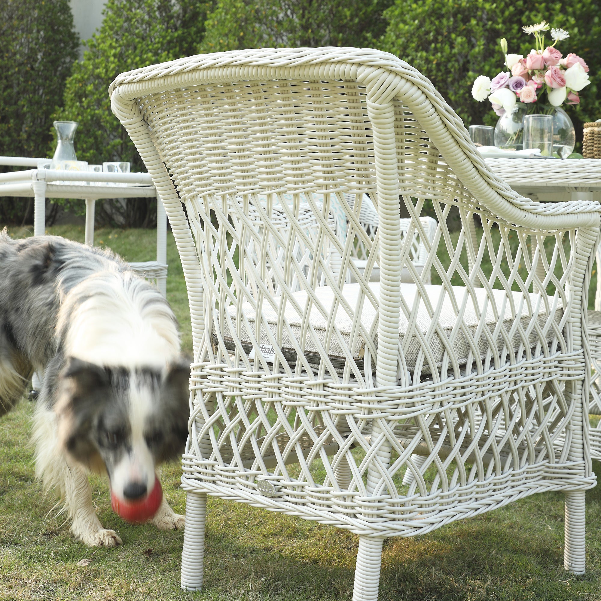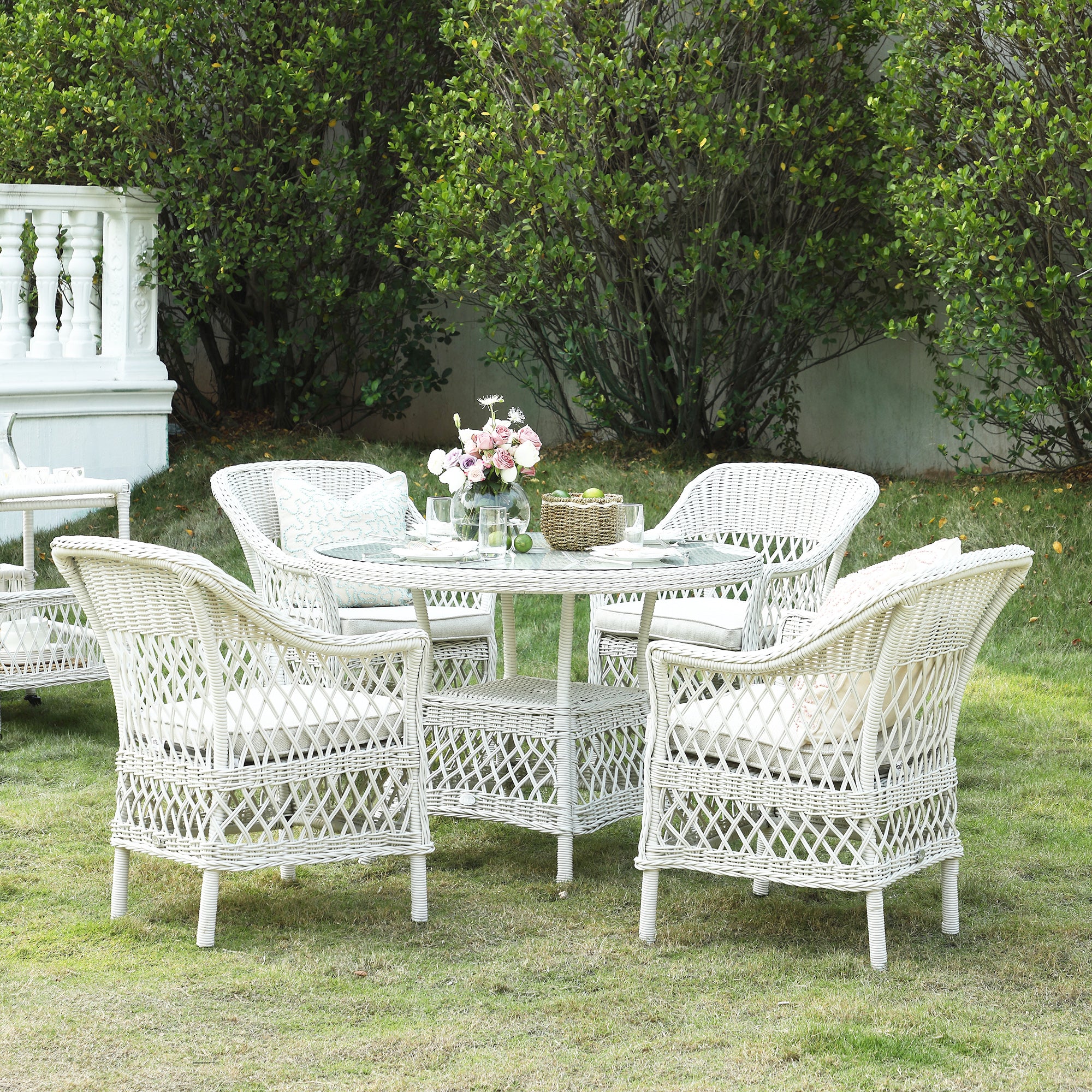 - Complete the look: Pictured with the Willowbrook Lattice Weave Rattan 4-Seater Round Dining Set, White, is our Dulcie Pink Wool French Knot Cushion.