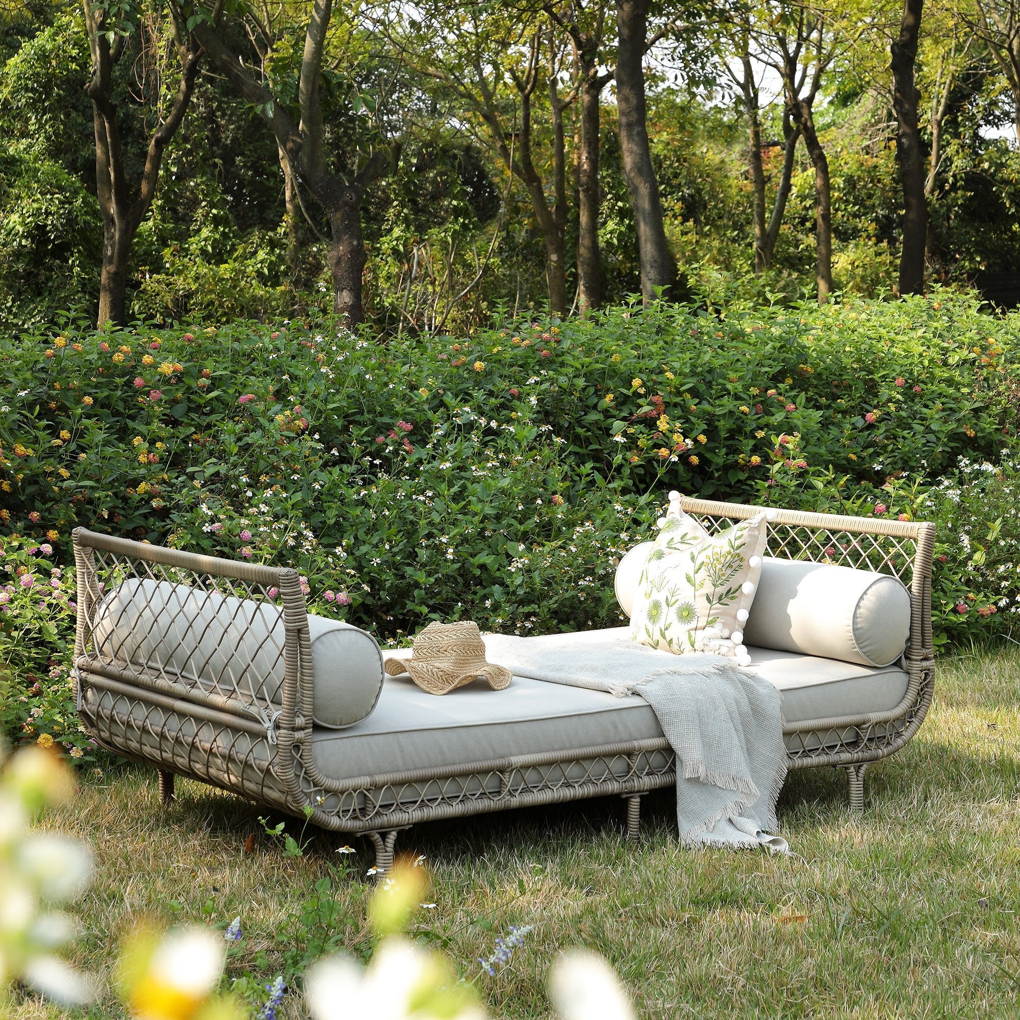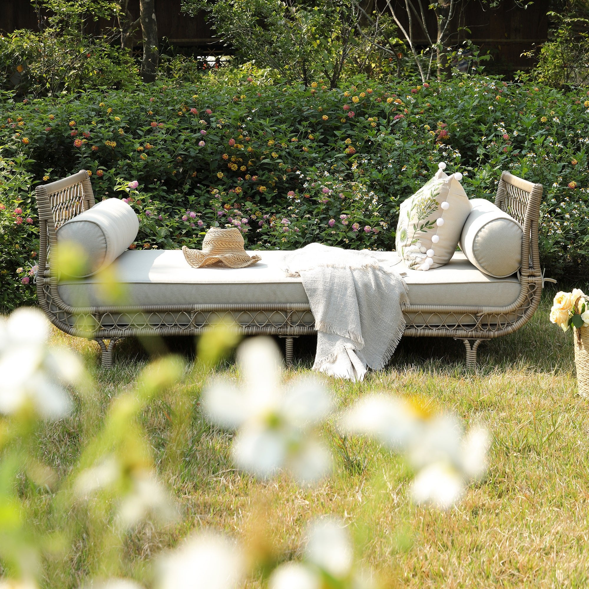 - Featuring robust round poly-rattan weaves hand-wrapped around aluminium frame, our Willowbrook daybed is a dreamy piece for your various outdoor and indoor settings.