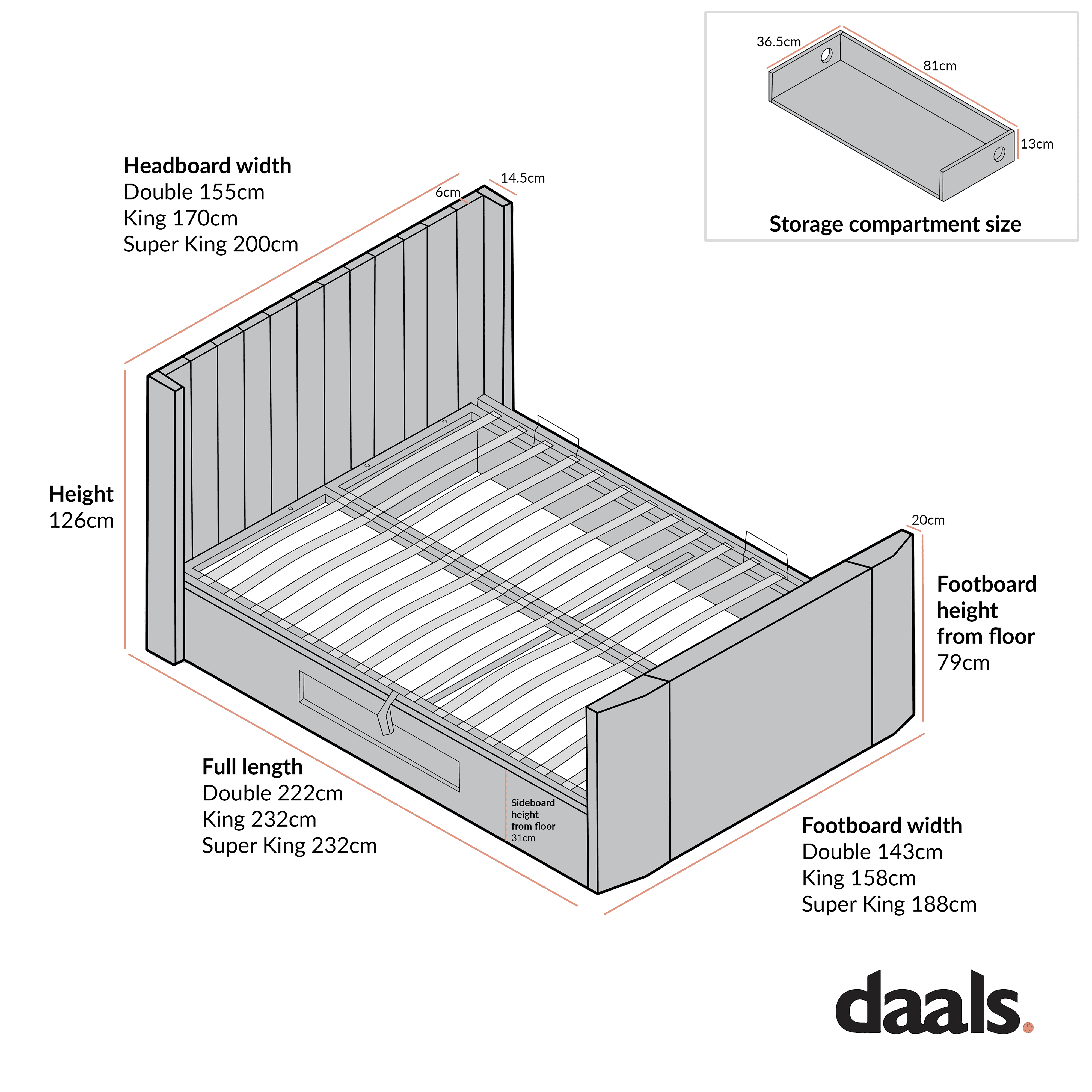 - 6FT Super King: W 200 x D 232 x H 126 cm / Bed weight: 137.5 kg