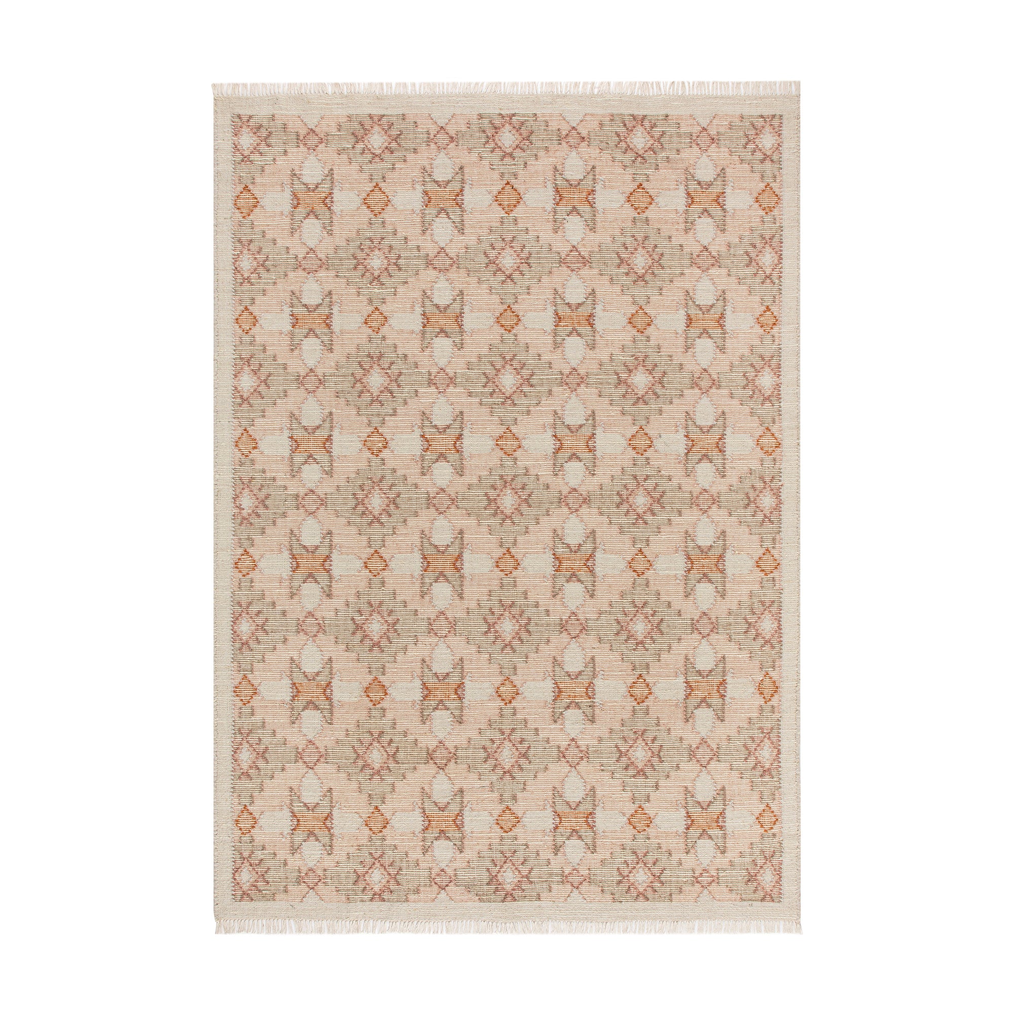 - Our Yasmin Kilim rug has a unique design featuring repeat geometric motifs in tones of pink, orange, beige and ivory. The rug is also enhanced with tassels that add to its authentic, handmade feel.