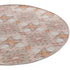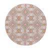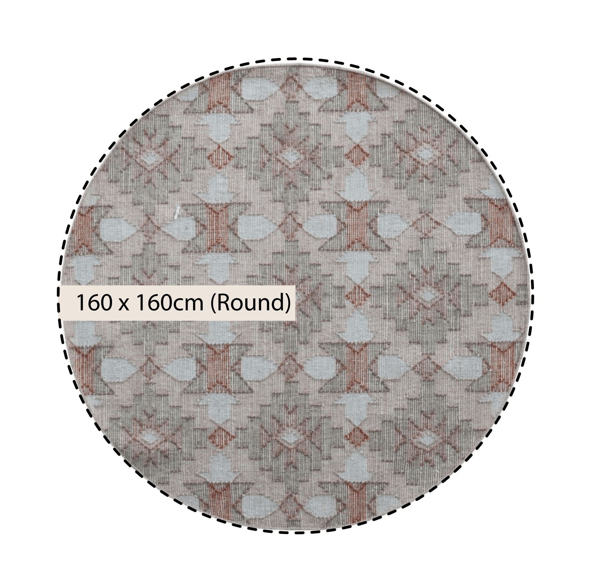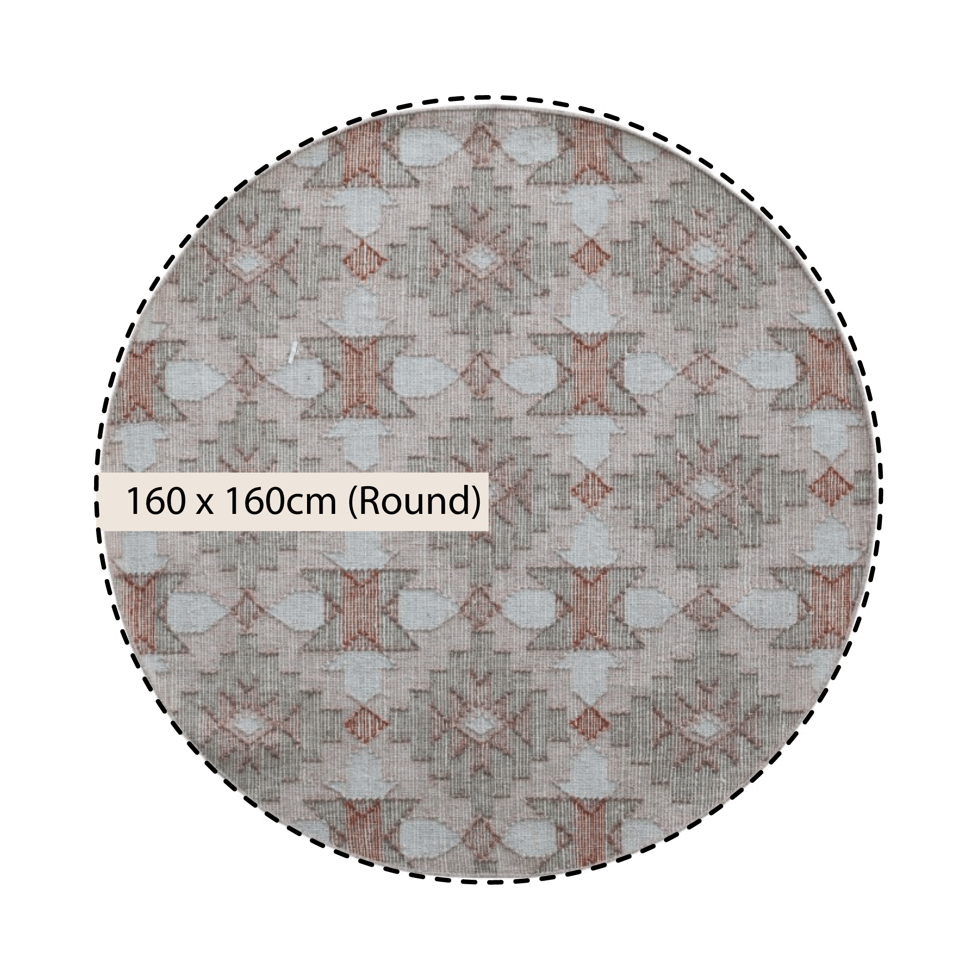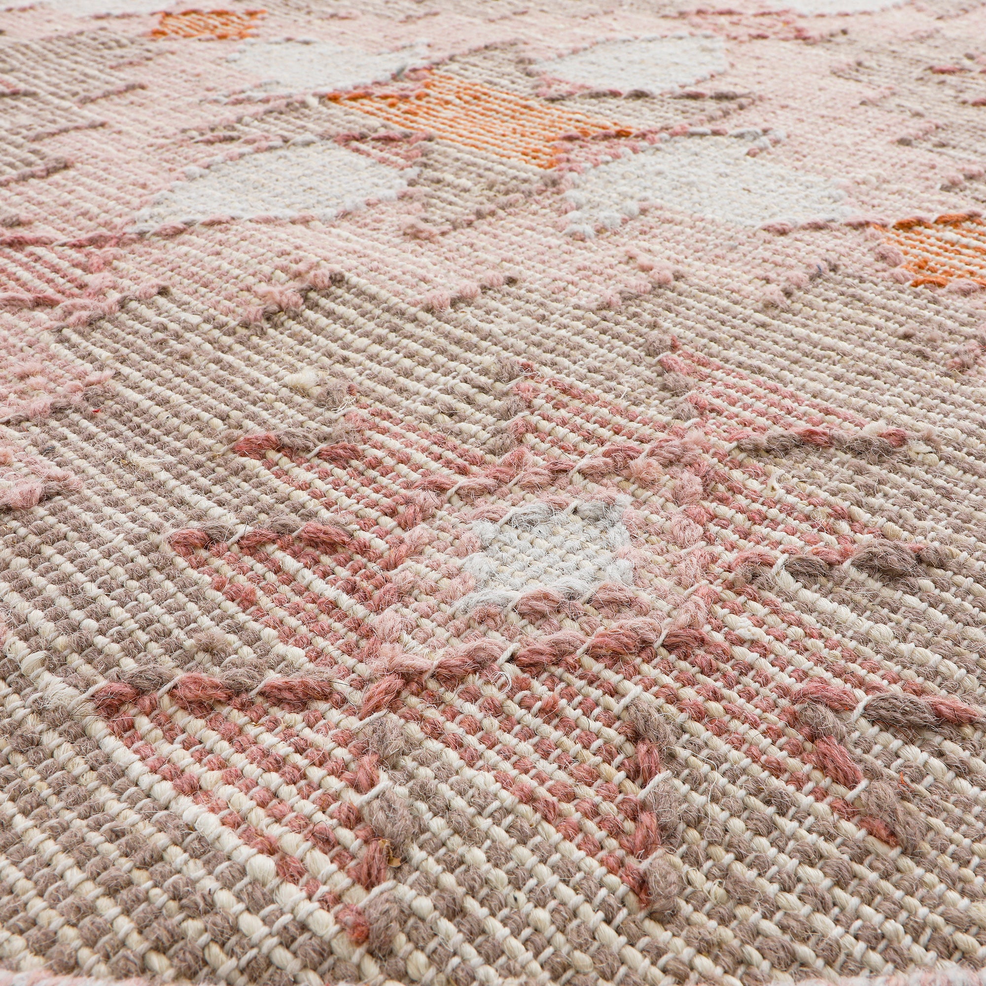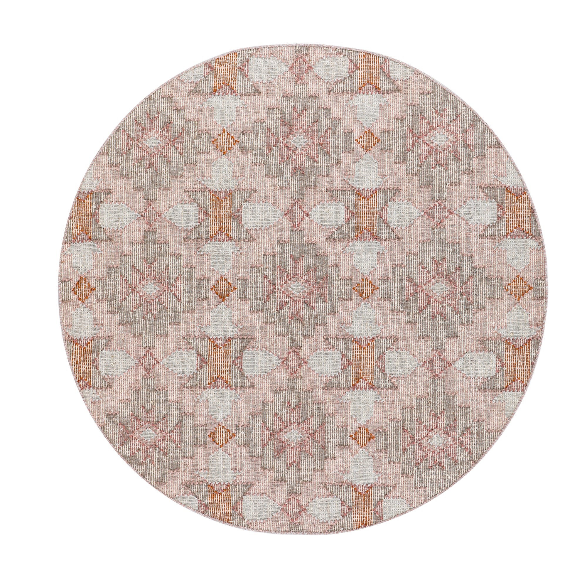 - Our Yasmin Kilim round rug has a unique design featuring repeat geometric motifs in tones of pink, orange, beige and ivory.